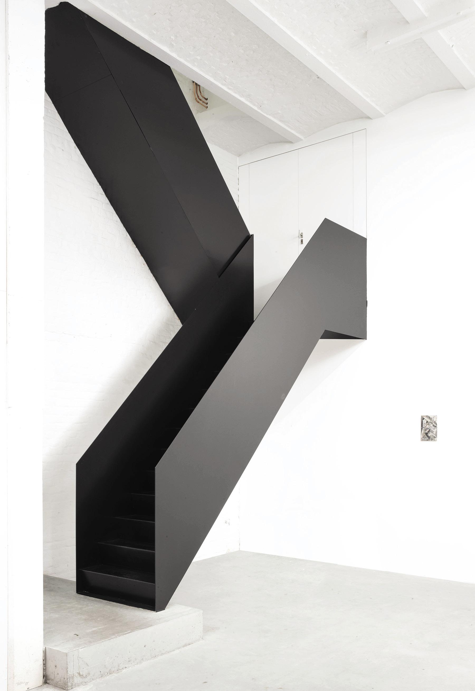 At this creative hub in Brussels, Belgium, which houses architect Noro Khachatryan’s studio, as well as a gallery space for Harlan Levey Projects, a welded switchback staircase connects the two levels.
