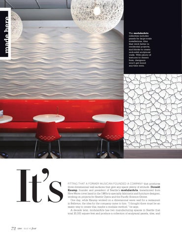 fitting that a former musician founded a company that produces three-dimensional wall surfaces that give any space plenty of attitude. Donald Kaump, founder and president of Seattle’s modularArts, transitioned from New Wave cover band in the 1980s to specialty fabricator and furniture designer, working on projects for Seattle Opera and the Pacific Science Center. One day, while Kaump worked on a dimensional wave wall for a restaurant in Bellevue, the idea for the company came to him. “I thought there must be an easier way to create this, maybe a modular method,” he says. A decade later, modularArts has two manufacturing spaces in Seattle that total 30,000 square feet and produce a collection of sculptural panels, tiles, and