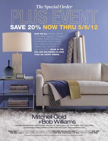 1106 West Burnside Street / 503.972.5000 / Mon thru Fri: 10am to 8pm, Sat: 10am to 6pm, Sun: 11am to 6pm Complimentary Parking Validation at PMC (12th and Couch) / www.mgbwhome.com Hunter sofa 100”w x 39”d x 31”h special orders in fabric from $2410 NOW: $1928, Manning side Table 26”w x 23”d x 22”h $870 NOW: $696, Tully Table lamp 31”h faux bone base with white fabric shade $445 NOW: $356, Powershag 8’ x 10’ rug in natural $1750 NOW: $1400