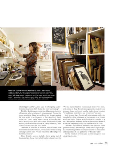 shockingly beautiful,â Ament says. âIt is the gritty, harderto-understand side of life that is the most fascinating.â The idea that things or rooms should possess elements of humor is what sets Amentâs interiors apart. Among the more surprising things you will see is a bronze casting by local artist Lynn Swanson of her daughterâs hand doing the âheavy metalâ sign, a snow globe collection, and a bronze bunny with only one ear. Ament encourages seeking out alternative sources as a way of keeping your interior distinct, and yes, a bit weird. âWe were in Montana on vacation, and we drove past this thrift store that was so old, it was kind of creepy looking actually,â Ament says. âThere, I found six different pieces I will have forever.â Other favorite sources include stores going out of business (she found two tufted leather chairs from the