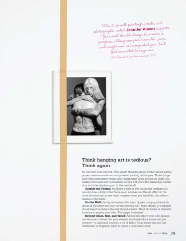Think hanging art is tedious? Think again. So you have your artwork. Now what? Much has been written about taking proper measurements and using classic framing techniques. Those things have their importance (truth: don’t hang stand-alone pieces too high), but luckily your house isn’t a museum, so why not throw the status quo out the door and take displaying art to the next level? Outside the Frame: Art doesn’t have to live within the confines of a wooden box—think of the frame as an extension of the art. After all, it’s three dimensional, so see what happens when you embellish the sides or insides of the frame. On the Wall: Go big and extend the reach of your hanging artwork by going off the frame and onto the surrounding wall. Paint, decals, or wallpaper are all ways to enhance the wall around a frame. Think of corners or dramatic locations to employ your idea. The bigger the better! Beyond Glass, Mat, and Wood: Almost any object with a flat surface can become a “frame” for your artwork. Look around the house and get creative—a clipboard, a mirror, a roll of fabric. Or go frame-less and use chalkboard or magnetic paint to create a cool feature wall. GRAY ISSUE No. three