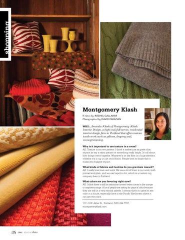 Interior Design, a high-end, full-service, residential interior design firm in Portland that offers custom textile work such as pillows, drapery and, monogramming. Why is it important to use texture in a room? AK: Texture is its own pattern. I think it makes just as great of an impact as say a zebra pattern or something really bright. Itâs all about how things come together. Whateverâs on the floor is a huge element, whether itâs a rug or just wood floors. People tend to forget that it makes the biggest impact. What kinds of fabrics and textiles do you gravitate toward? AK: I really love linen and wool. We use a lot of linen in our work, both printed and plain, and we use Lapchi a lot, which is a custom rug company here in Portland. What colors are you favoring right now? AK: I think there is still an attraction toward warm tones in the orange or raspberry range. A lot of people are asking for pops of color because they are still in a very neutral palette. I always think itâs great to see color in a house, especially here in the Pacific Northwest where it can get very dark. 1111 S.W. Alder St., Portland, (503) 224-7797, montgomeryklash.com