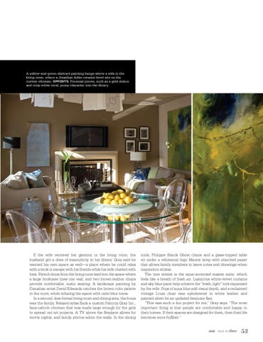 nook, Philippe Starck Ghost chairs and a glass-topped table sit under a whimsical Ingo Maurer lamp with attached paper that allows family members to leave notes and drawings when inspiration strikes. The true retreat is the aqua-accented master suite, which feels like a breath of fresh air. Luxurious white-velvet curtains and sky-blue paint help achieve the “fresh, light” look requested by the wife. Pops of aqua blue add visual depth, and a reclaimed vintage Louis chair was upholstered in white leather and painted silver for an updated feminine flair. “This was such a fun project for me,” Gray says. “The most important thing is that people are comfortable and happy in their homes. If their spaces are designed for them, then their life becomes more fulfilled.” GRAY ISSUE No. three