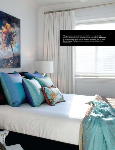 A large custom mirror bordered in dark wood is perfect for morning dressing, while bright turquoise lamps from The Cross sit on either side of the bed. A painting above the bed by artist Karen Lorena Parker reflects both the dark and light hues of the room.
