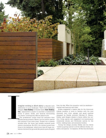 magine writing a short story to describe each destination in your landscape. Thatâs how landscape designer Scot Eckley of Seattle-based Scot Eckley, Inc., approached a project to renovate a mismatched series of patios, decks, and terraces surrounding his clientsâ contemporary Mercer Island home. The professional couple loved the seclusion their sunrise-facing property offered, but its outdoor spaces did nothing to lure them there. Tucked into a heavily wooded area, the home had initially received some interior renovations. By 2010, the owners turned their focus to the landscape, where more than 40 huge containers cluttered the grounds like paratroopers dropped
