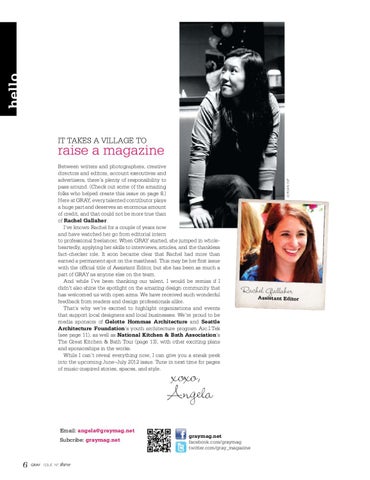 Between writers and photographers, creative directors and editors, account executives and advertisers, there’s plenty of responsibility to pass around. (Check out some of the amazing folks who helped create this issue on page 8.) Here at GRAY, every talented contributor plays a huge part and deserves an enormous amount of credit, and that could not be more true than of Rachel Gallaher. I’ve known Rachel for a couple of years now and have watched her go from editorial intern to professional freelancer. When GRAY started, she jumped in wholeheartedly, applying her skills to interviews, articles, and the thankless fact-checker role. It soon became clear that Rachel had more than earned a permanent spot on the masthead. This may be her first issue with the official title of Assistant Editor, but she has been as much a part of GRAY as anyone else on the team. And while I’ve been thanking our talent, I would be remiss if I didn’t also shine the spotlight on the amazing design community that has welcomed us with open arms. We have received such wonderful feedback from readers and design professionals alike. That’s why we’re excited to highlight organizations and events that support local designers and local businesses. We’re proud to be media sponsors of Gelotte Hommas Architecture and Seattle Architecture Foundation’s youth architecture program Arc.I.Tek (see page 11), as well as National Kitchen & Bath Association’s The Great Kitchen & Bath Tour (page 13), with other exciting plans and sponsorships in the works. While I can’t reveal everything now, I can give you a sneak peek into the upcoming June–July 2012 issue. Tune in next time for pages of music-inspired stories, spaces, and style.