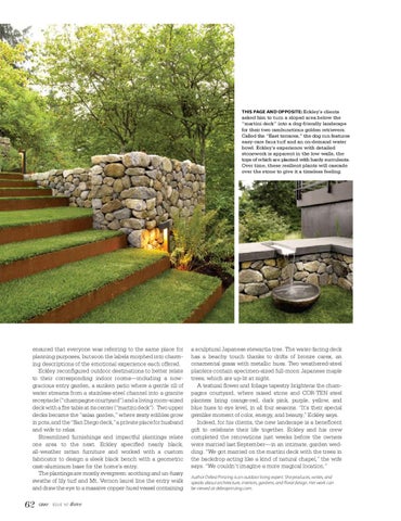 a sculptural Japanese stewartia tree. The water-facing deck has a beachy touch thanks to drifts of bronze carex, an ornamental grass with metallic hues. Two weathered-steel planters contain specimen-sized full-moon Japanese maple trees, which are up-lit at night. A textural flower and foliage tapestry brightens the champagne courtyard, where raised stone and COR-TEN steel planters bring orange-red, dark pink, purple, yellow, and blue hues to eye level, in all four seasons. “It’s their special gemlike moment of color, energy, and beauty,” Eckley says. Indeed, for his clients, the new landscape is a beneficent gift to celebrate their life together. Eckley and his crew completed the renovations just weeks before the owners were married last September—in an intimate, garden wedding. “We got married on the martini deck with the trees in the backdrop acting like a kind of natural chapel,” the wife says. “We couldn’t imagine a more magical location.” Author Debra Prinzing is an outdoor living expert. She produces, writes, and speaks about architecture, interiors, gardens, and floral design. Her work can be viewed at debraprinzing.com.