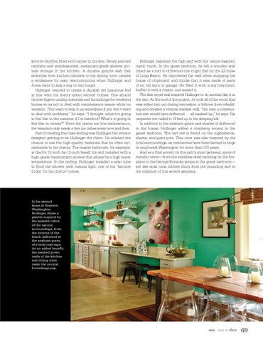 favorite Godfrey Hirst wool carpet in the den. Newly painted cabinets and stainless-steel, restaurant-grade shelves provide storage in the kitchen. A durable granite slab that stretches from kitchen cabinets to the dining room creates a workspace for easy telecommuting when Hullinger and Jones want to stay a day or two longer. Hullinger wanted to create a durable yet luxurious feel in line with his theory about second homes: One should choose higher-quality materials and furnishings for weekend homes so as not to deal with maintenance issues while on vacation. âYou want to step it up sometimes if you donât want to deal with problems,â he says. âI thought, whatâs it going to feel like in the summer if Iâm barefoot? Whatâs it going to feel like in winter?â Even the plants are low-maintenance; the terrarium only needs a few ice cubes every now and then. Part of creating that luxe feeling was Hullinger the interior designer getting to be Hullinger the client. He relished the chance to use the high-quality materials that he often recommends to his clients. The master bathroom, for example, is tiled in 12-inch-by-12-inch basalt tile and installed with a high-grade thermostatic shower that allows for a high water temperature. In the ceiling, Hullinger installed a solar tube to flood the shower with natural light, one of his âfavorite tricksâ for his clientsâ homes.