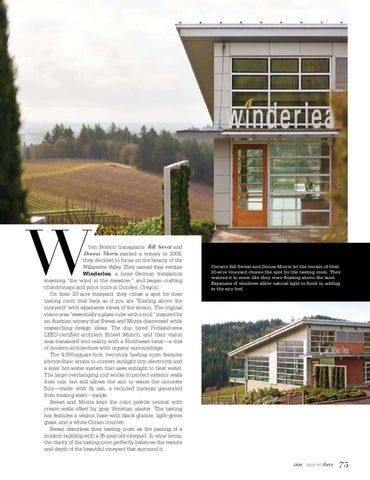 hen Boston transplants Bill Sweat and Donna Morris started a winery in 2006, they decided to focus on the beauty of the Willamette Valley. They named their venture Winderlea, a loose German translation meaning âthe wind in the meadow,â and began crafting chardonnays and pinot noirs in Dundee, Oregon. On their 20-acre vineyard, they chose a spot for their tasting room that feels as if you are âfloating above the vineyardâ with expansive views of the terrain. The original vision was âessentially a glass cube with a roof,â inspired by an Austrian winery that Sweat and Morris discovered while researching design ideas. The duo hired Portland-area LEED-certified architect Ernest Munch, and their vision was translated into reality with a Northwest twistâa mix of modern architecture with organic surroundings. The 4,000-square-foot, two-story tasting room features photovoltaic arrays to convert sunlight into electricity and a solar hot-water system that uses sunlight to heat water. The large overhanging roof works to protect exterior walls from rain but still allows the sun to warm the concrete floorâmade with fly ash, a recycled material generated from making steelâinside. Sweat and Morris kept the color palette neutral with cream walls offset by gray Venetian plaster. The tasting bar features a walnut base with black granite, light-green glass, and a white Corian counter. Sweat describes their tasting room as the pairing of a modern building with a 35-year-old vineyard. In wine terms, the clarity of the tasting room perfectly balances the texture and depth of the beautiful vineyard that surround it.
