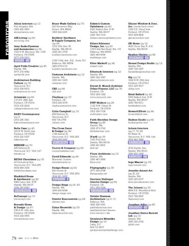 Amy Sacks Eyewear and Accessories (pg 32) 1532 S.W. Morrison, Ste. 1000 Portland, OR 97205 (877) 274-0410 amysacks.com April Pride Creative (pg 40) Seattle, WA (877) 272-4042 aprilpride.com Architecture Building Culture (pg 79) Vancouver, B.C. (503) 208-6515 architecture-bc.com Artemisia (pg 64) 110 S.E. 28th Ave. Portland, OR 97214 (503) 232-8224 collagewithnature.com BAKU Contemporary (pg 3) (253) 265-3921 bakucontemporary.com Bella Casa (pg 40) 223 N.W. Ninth Ave. Portland, OR 97209 (503) 222-5337 bellacasa.net BENSEN (pg 72) 405 Railway St. Vancouver, B.C. V6A 1A7 bensen.ca BETA5 Chocolates (pg 16) 413 Industrial Ave. Vancouver, B.C. V6A 2P8 (604) 669-3336 beta5chocolates.com Blackbird Home & Apothecary (pg 82) 5465 Leary Ave. N.W. Seattle, WA 98107 (206) 297-6093 blackbirdballard.com BoConcept (pg 10) boconcept.com Bravado Home & Design (pg 67) 536 N.W. 14th Ave. Portland, OR 97209 (503) 224-0555 bravadohome.com