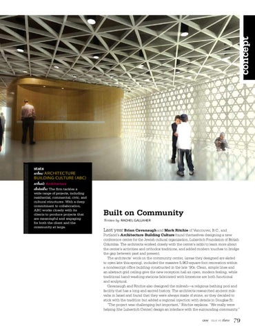 Portlandâs Architecture Building Culture found themselves designing a new conference center for the Jewish cultural organization, Lubavitch Foundation of British Columbia. The architects worked closely with the centerâs rabbi to learn more about the centerâs activities and orthodox traditions, and added modern touches to bridge the gap between past and present. The architectsâ work on the community center, (areas they designed are slated to open late this spring), included the massive 5,963-square-foot renovation within a nondescript office building constructed in the late â90s. Clean, simple lines and an abstract grid ceiling give the new reception hall an open, modern feeling, while traditional hand-washing stations fabricated with limestone are both functional and sculptural. Cavanaugh and Ritchie also designed the mikvahâa religious bathing pool and facility that has a long and sacred history. The architects researched ancient mikvahs in Israel and found that they were always made of stone, so they decided to stick with the tradition but added a regional injection with details in Douglas fir. âThe project was challenging but important,â Ritchie explains. âWe really were helping [the Lubavitch Center] design an interface with the surrounding community.â GRAY ISSUE No. three