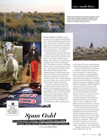 dyeing plant in Hickory, North Carolina, to a knitting company in Los Angeles. This isn’t Imperial Ranch’s first foray into fashion, though it’s certainly the most high profile. In 1999, during a period of offshoring and globalization that contributed to 26,000 American sheep producers going out of business, the ranch lost its wool buyer to a cheaper producer overseas. In response, Jeanne started a homegrown clothing operation, recruiting 20 local women to make garments with Imperial Stock wool. In 2009, she partnered with designer Anna Cohen to headline Portland’s fashion week with a ranch-to-runway collection. Carver and Cohen are currently working on their 2014 line, Imperial Collection by Anna Cohen. And the ranch’s collaboration with Ralph Lauren may continue—it is now sampling for the designer’s fall season. Carver’s family and ranch staff are still reeling from their recent successes: the Ralph Lauren deal doubled their sales and has kept Carver busy with emails and phone calls from a growing number of interested companies. But she has no complaints. “After many decades of obscurity on this ranch, now all of a sudden we’re on people’s radars,” Carver says. “This whole thing … is bigger than dreams. I never would have dreamed this big.” h GRAY ISSUE No. FOURTEEN