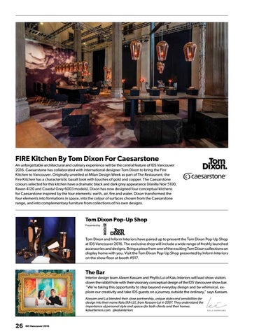 FIRE Kitchen By Tom Dixon For Caesarstone An unforgettable architectural and culinary experience will be the central feature of IDS Vancouver 2016. Caesarstone has collaborated with international designer Tom Dixon to bring the Fire Kitchen to Vancouver. Originally unveiled at Milan Design Week as part of The Restaurant, the Fire Kitchen has a characteristic basalt look with touches of gold and copper. The Caesarstone colours selected for this kitchen have a dramatic black and dark grey appearance (Vanilla Noir 5100, Raven 4120 and Coastal Grey 6003 models). Dixon has now designed four conceptual kitchens for Caesarstone inspired by the four elements: earth, air, fire and water. Dixon transformed the four elements into formations in space, into the colour of surfaces chosen from the Caesarstone range, and into complementary furniture from collections of his own designs.