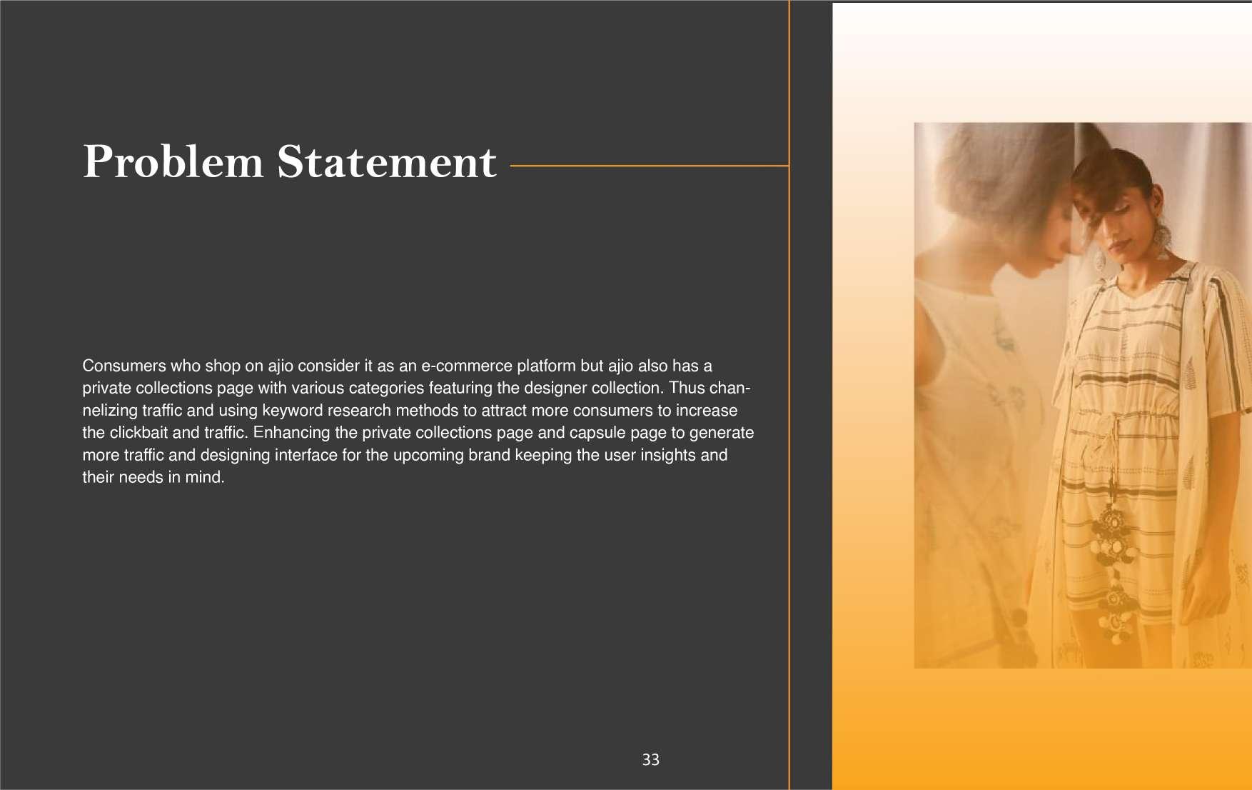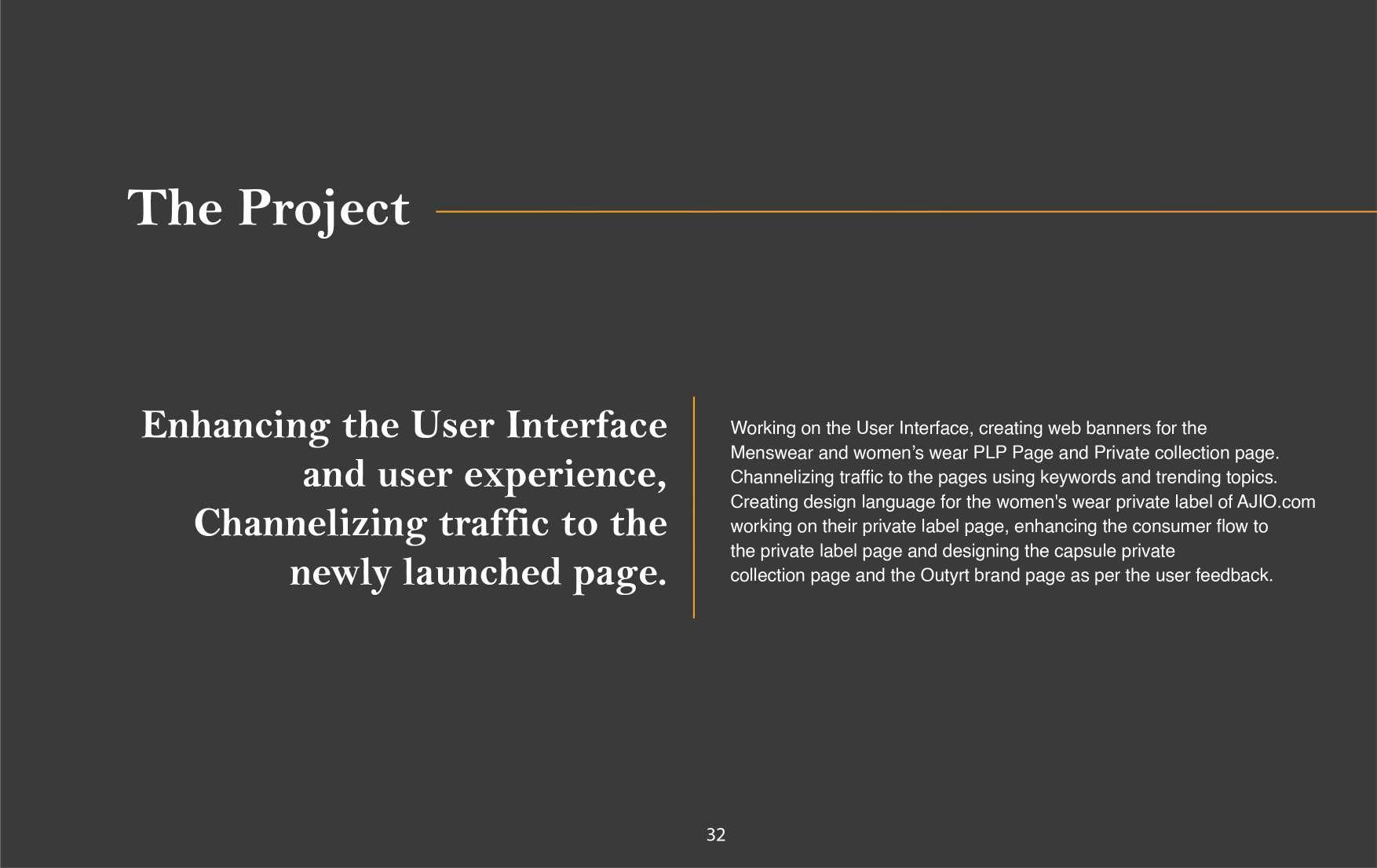 Working on the User Interface, creating web banners for the Menswear and women’s wear PLP Page and Private collection pages. Channelizing traffic to the pages using keywords and trending topics. Creating design language for the women's wear private label of AJIO working on their private label page, enhancing the consumer flow to the private label page and designing the capsule private collection page as per the user feedback.