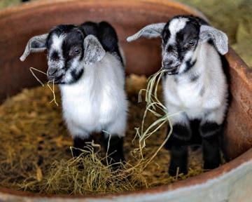 “Young mini-Nubian goats enjoy breakfast in the barn.”