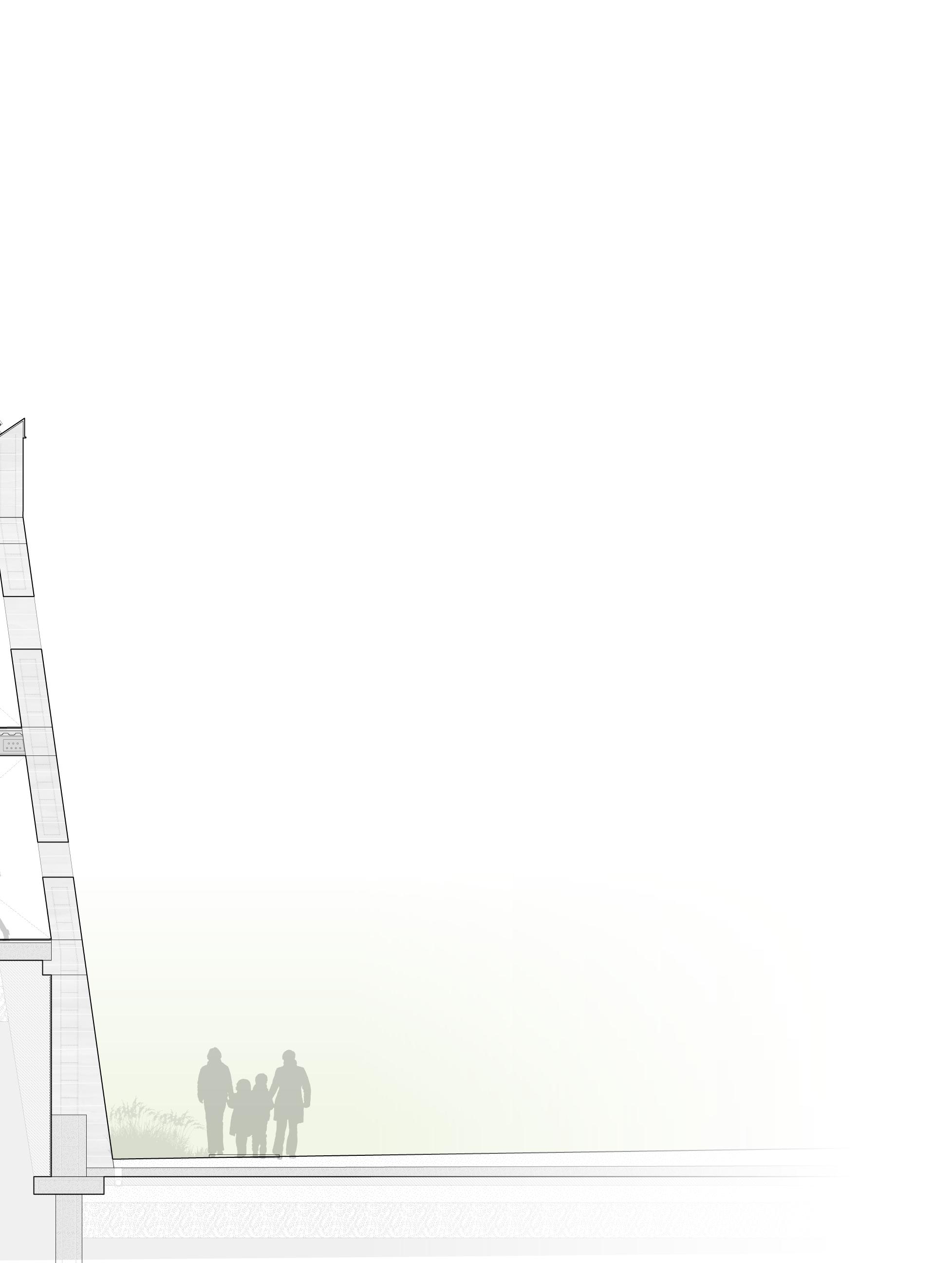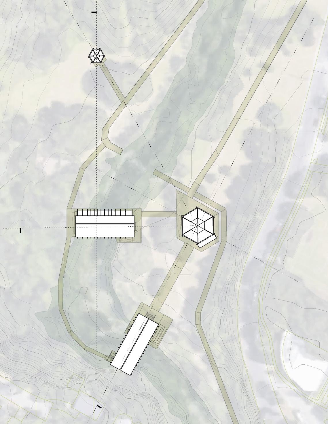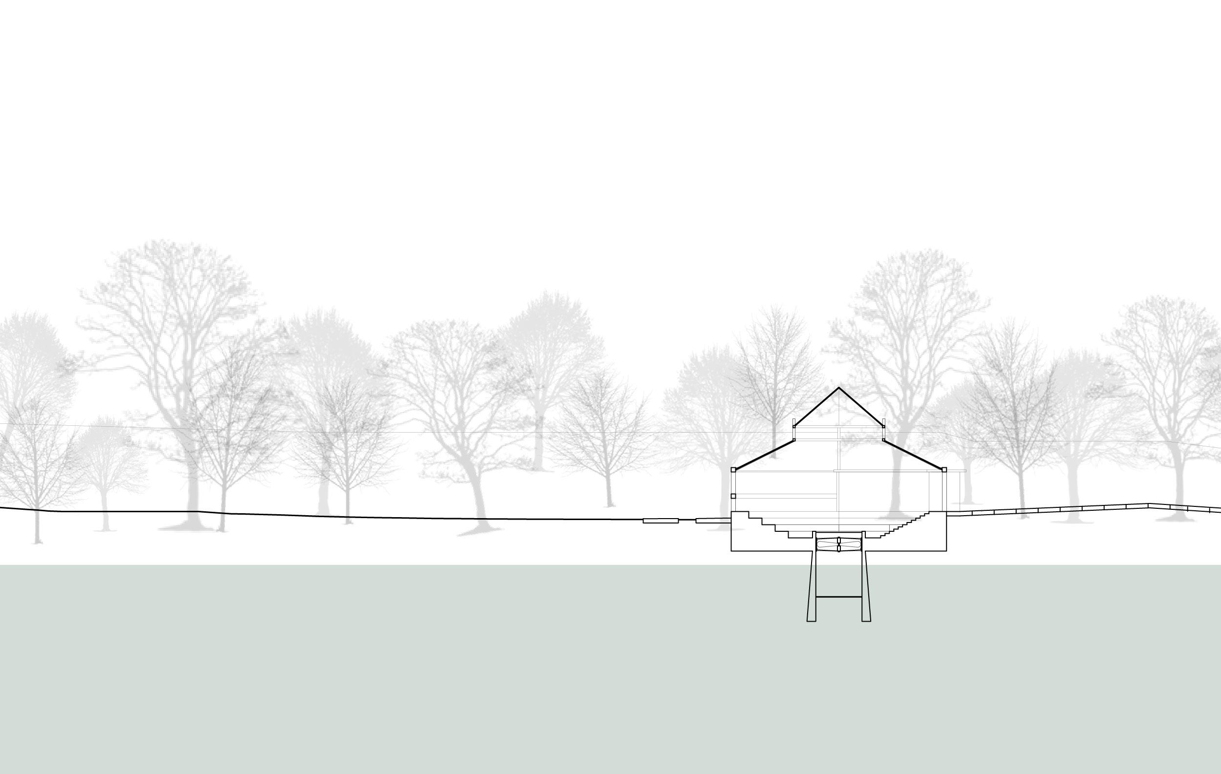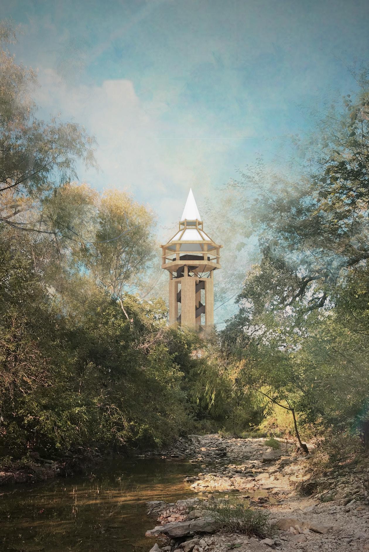 The tower is an introspective observatory; withdrawn from the other structures, it stands as a noble landmark among the trees. This is a space for gaining new perspective on the world around us.