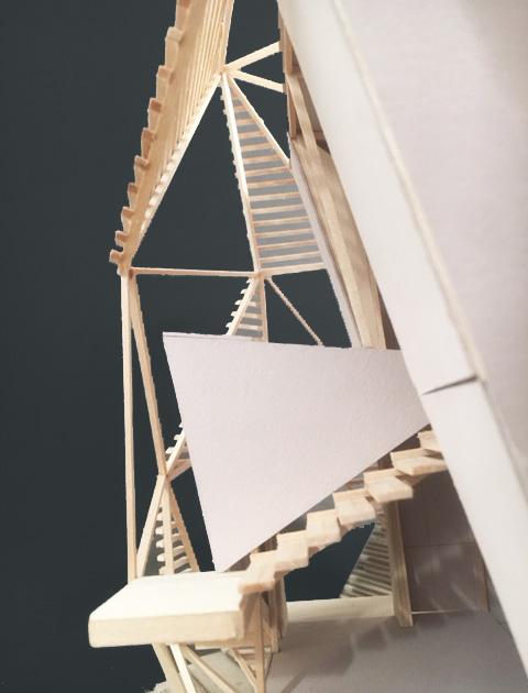 This studio was focused on the articulation of space between layers of construction. This facilitated the exploration of the manipulation of interstitial spaces and how this changes the experiential qualities of the design. In this unconventional residence, the inner layer reads as solid “trunks”. The outer layer is composed of completely tectonic frame elements that tessellate and fly out from the inner layer. While the inner layer provides stability and solidity, the outer layer captures an imaginative space where one can dances along the changing elevations like meandering branches. The tessellated frame still provides some protection and fragmentation of sunlight like a permeable canopy.