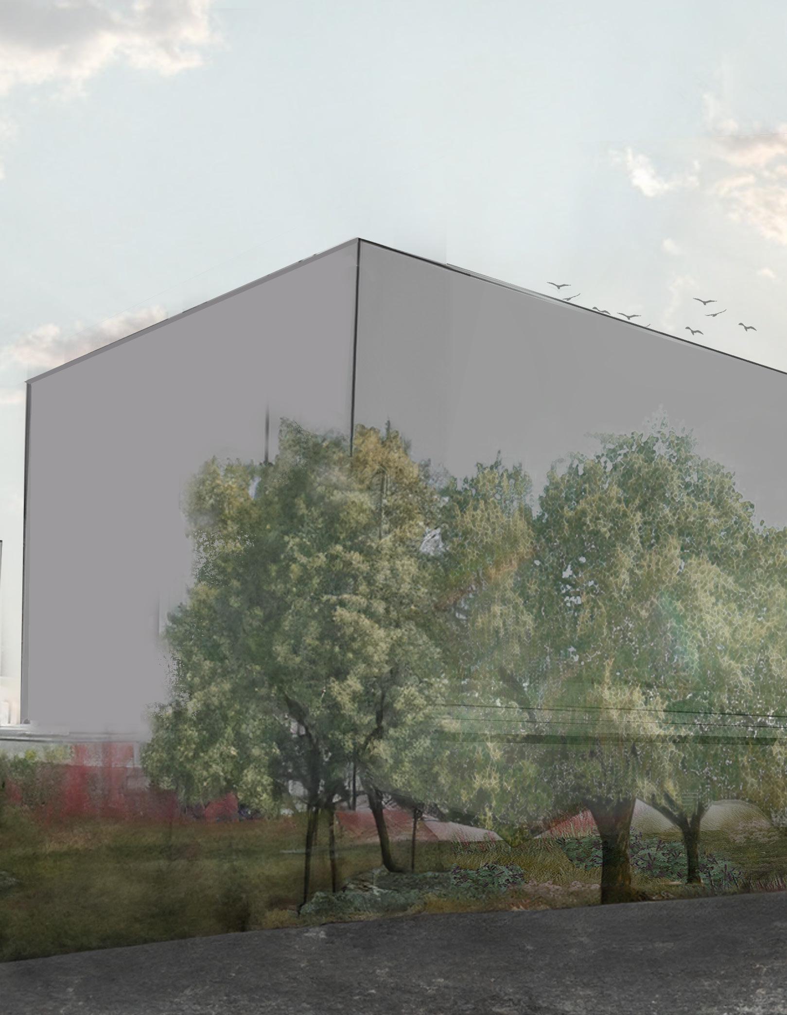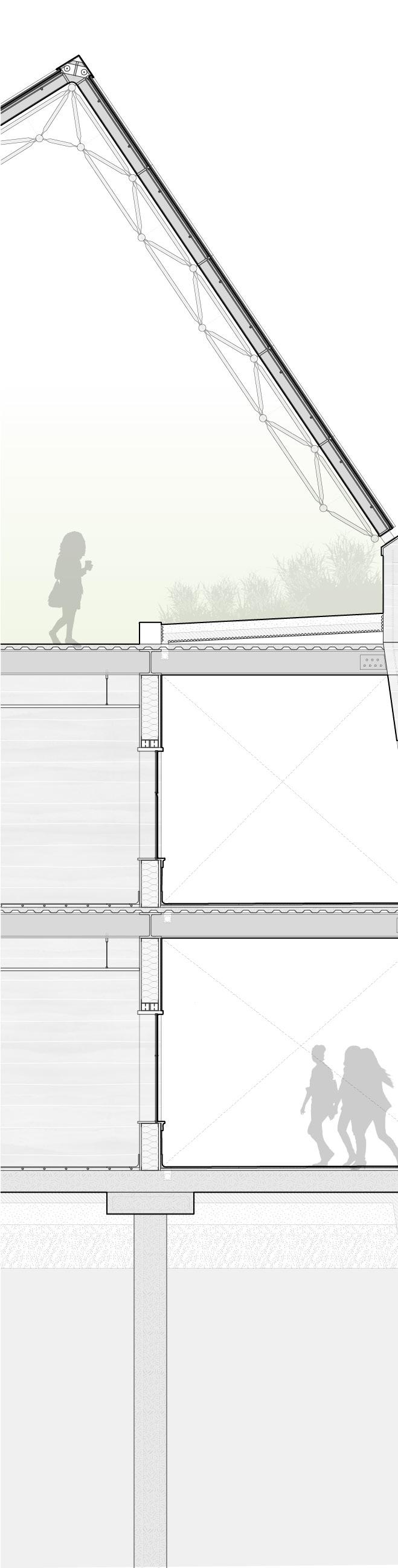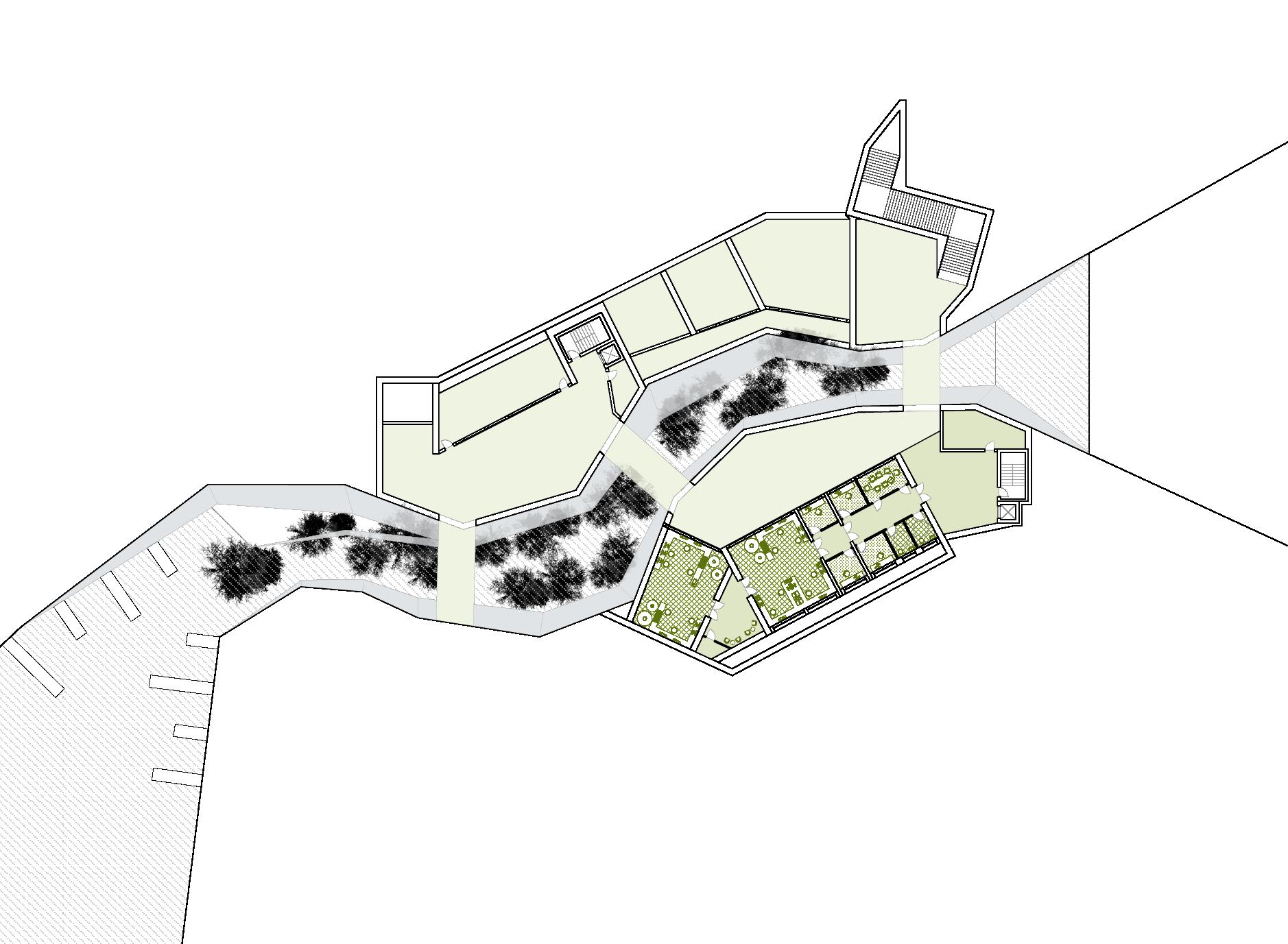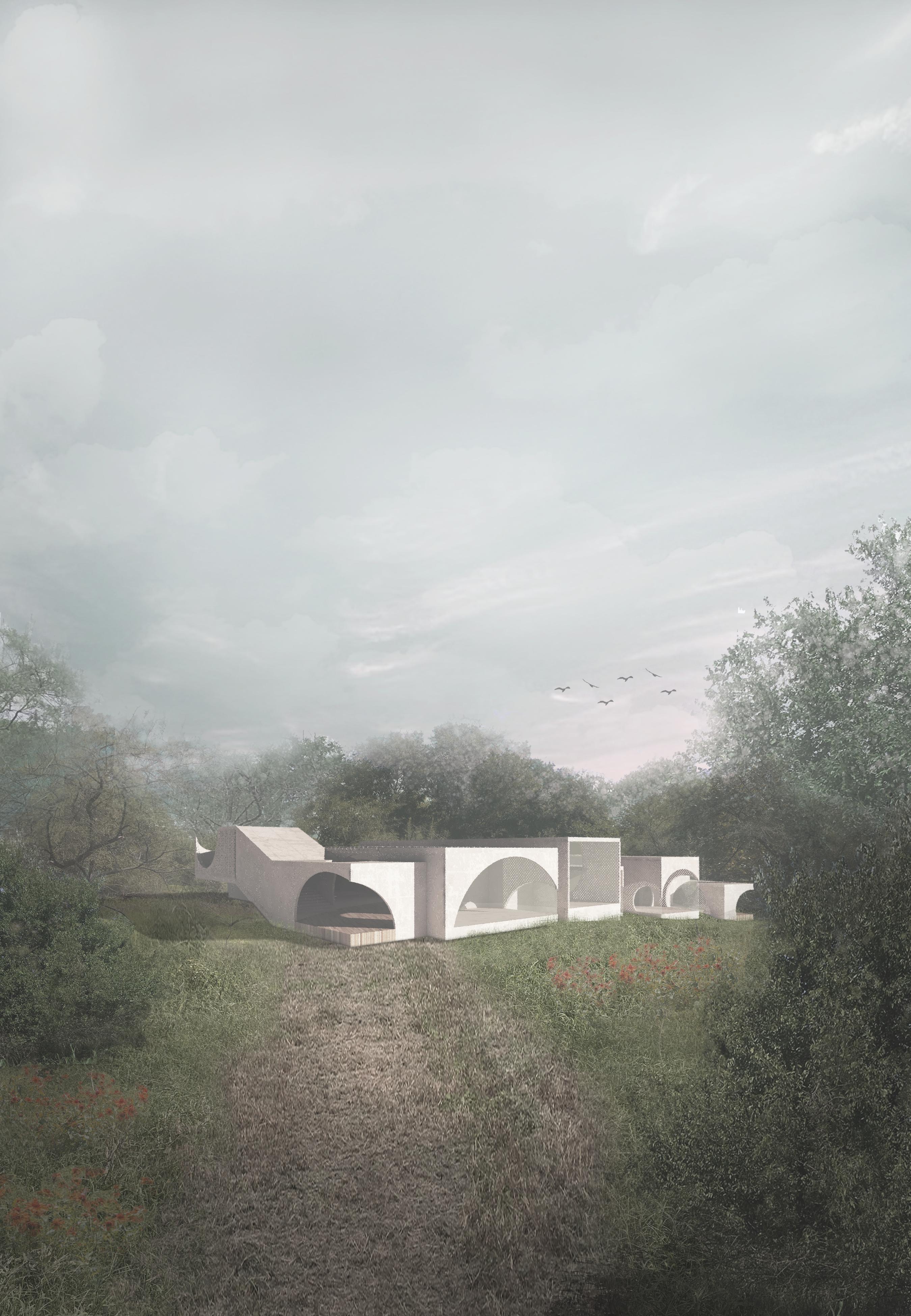 The building is composed of a series of open rectilinear volumes that from the exterior mimic residential forms, however from within, these normal volumes are spliced with voids where nature can infest the building.