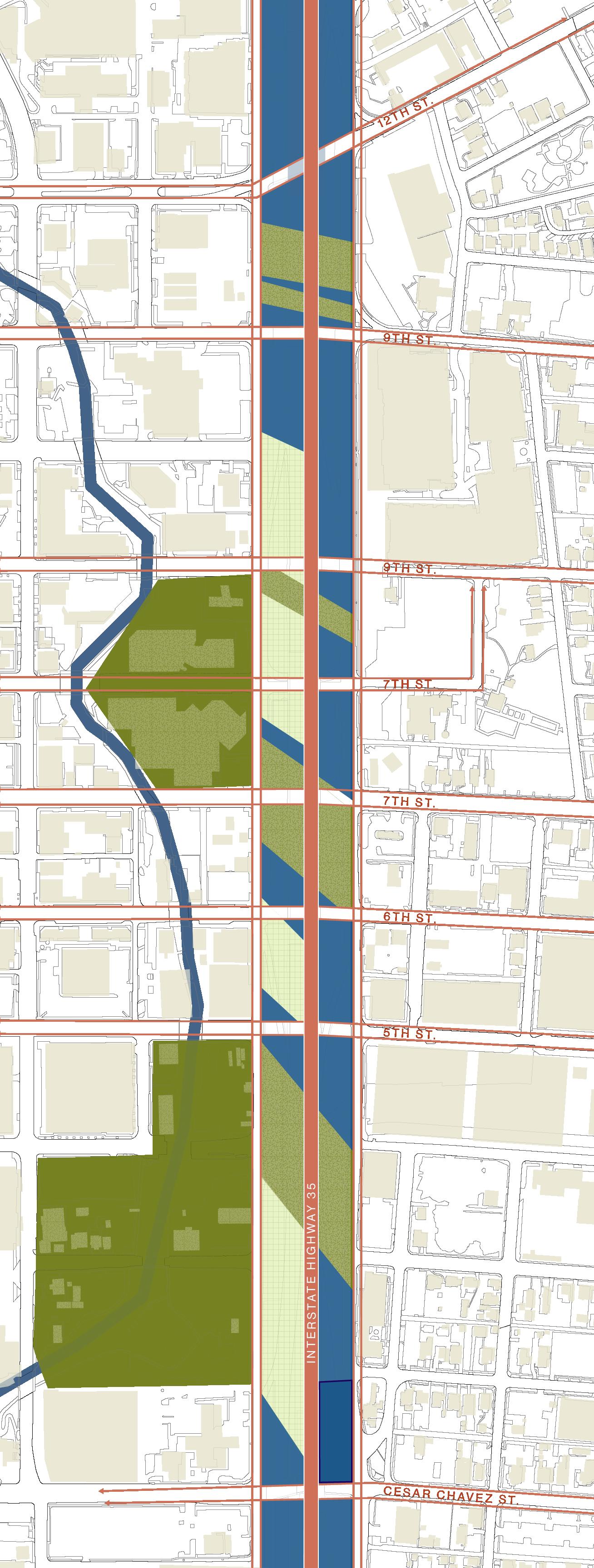 The next part of our strategy is the zoning of the rest of the space around the old highway infrastructure. The capitol view corridors, overlay zoning, were used to divide the space. The first zone was designated for development, with mixed used and diverse housing options for the rapidly gentrifying city. The second zone is reserved for public open space. The final zone allows nature free reign, areas where the native Central Texas wildlife can flourish and rebuild the ecosystems that have been lost due to environmental carelessness.