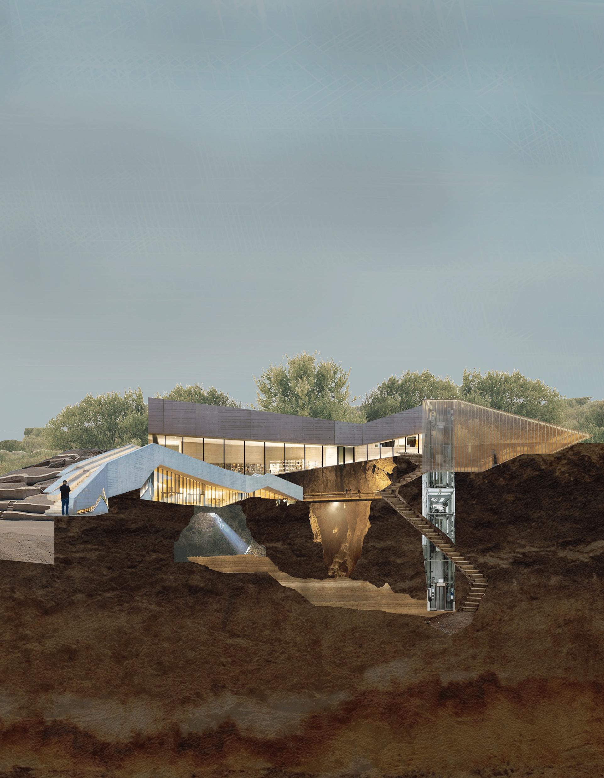 Secondly, the procession through the building mirrors the water cycle itself. From the entrance of the building, one can run over the building like run-off or one can descend or percolate into the ground. Below-grade, the user delves into the exhibition experience, where they are privileged to views of the water research labs and artist installations. Following this, the user will re-emerge into the above-ground world, evaporating to where they began again.