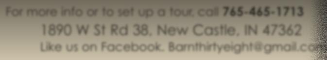 New! Heating and air conditioning for a longer venue season! For more info or to set up a tour, call 765-465-1713 1890 W St Rd 38, New Castle, IN 47362 Like us on Facebook. Barnthirtyeight@gmail.com