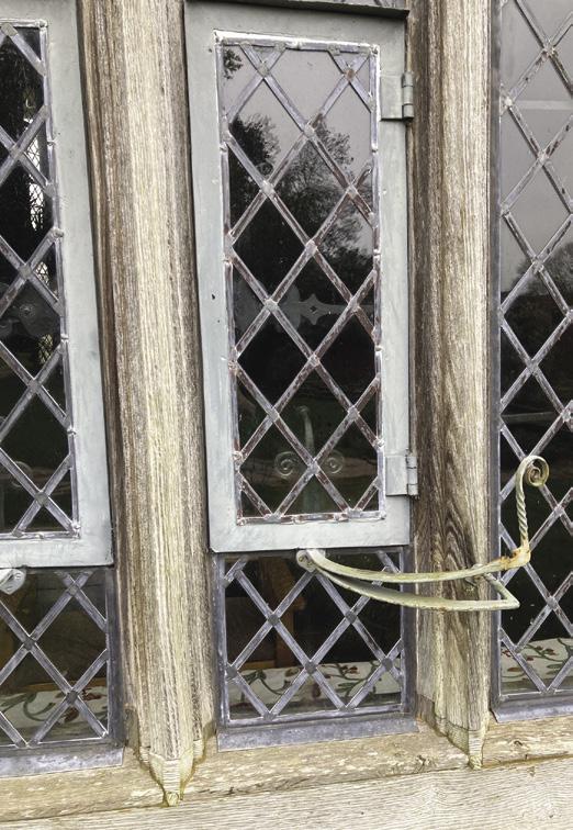 Quadrant stay on a casement window at Great Dixter. These often date from the seventeenth or eighteenth centuries. The upper part of the split bar acts as a spring and will hold the window open at any point along the arc.