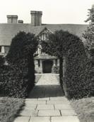Left, Daisy – favouring Alpine dress by this time - with Christo, Letitia and Bunch in the garden, 1935. Right, the yew arch (not yet fully formed when this photograph was taken) at the entrance to Great Dixter that Daisy was happy to see removed in 1931.