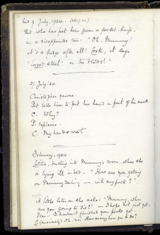 Above, The Lloyd family, clockwise: Letitia (born 1919), Selwyn (1908), Patrick (1913), Oliver (1911), Quentin (1915), Christopher (1921), Nathaniel (1867), and Daisy (1881). Left, a page from Daisy’s book of her children’s sayings.
