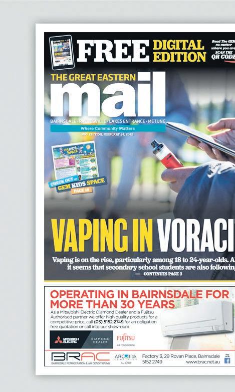 The Great Eastern Mail MAY 10, 2024 03 Find us on AU 53028 As a Mitsubishi Electric Diamond Dealer and a Fujitsu Authorised partner we offer high quality products for a competitive price, call (03) 5152 2749 for an obligation free quotation