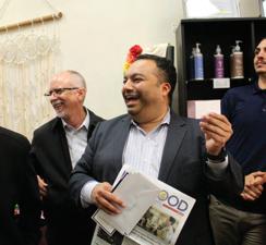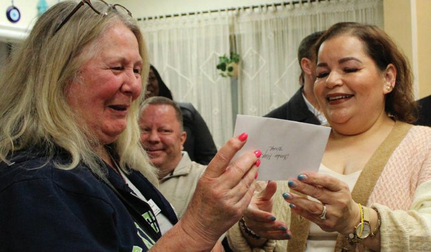 HAPPINESS IS CONTAGIOUS! Lakewood Women's Club member Debbie Ruhlow was happy to win a raffle prize at the March Chamber Mixer hosted by Vida y Alma: House of Beauty co-owner Erika Parada, also a Women's Club member.