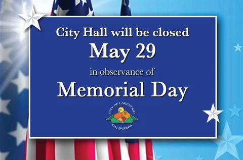 City Hall will be closed on May 29 in observance of Memorial Day.