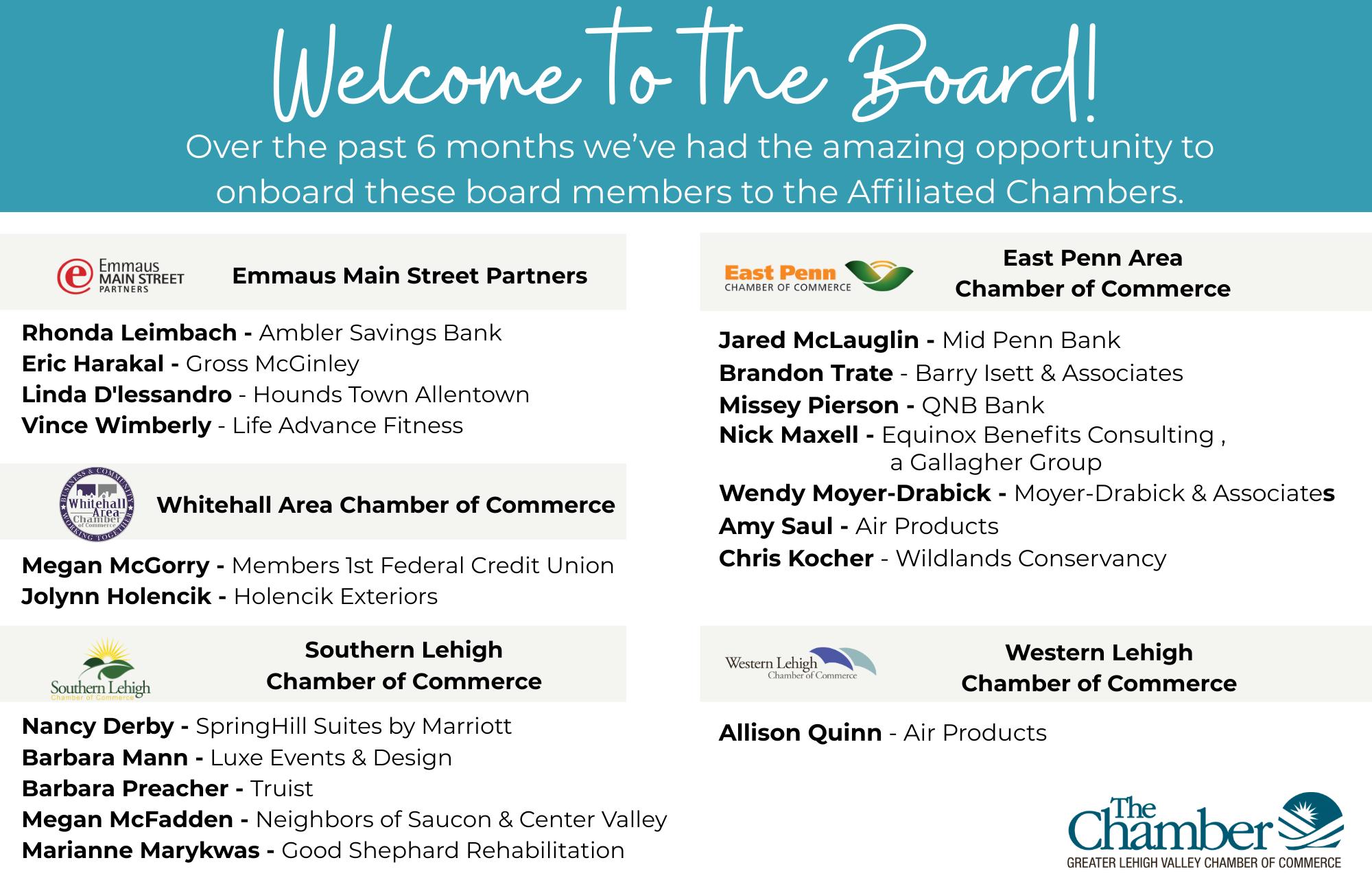 Affiliated Chambers (East Penn, Emmaus Main Street Partners, Hellertown-Lower Saucon, Greater Northern Lehigh, Southern Lehigh, Western Lehigh, Whitehall, Nazareth Area, Greater Northampton Area)