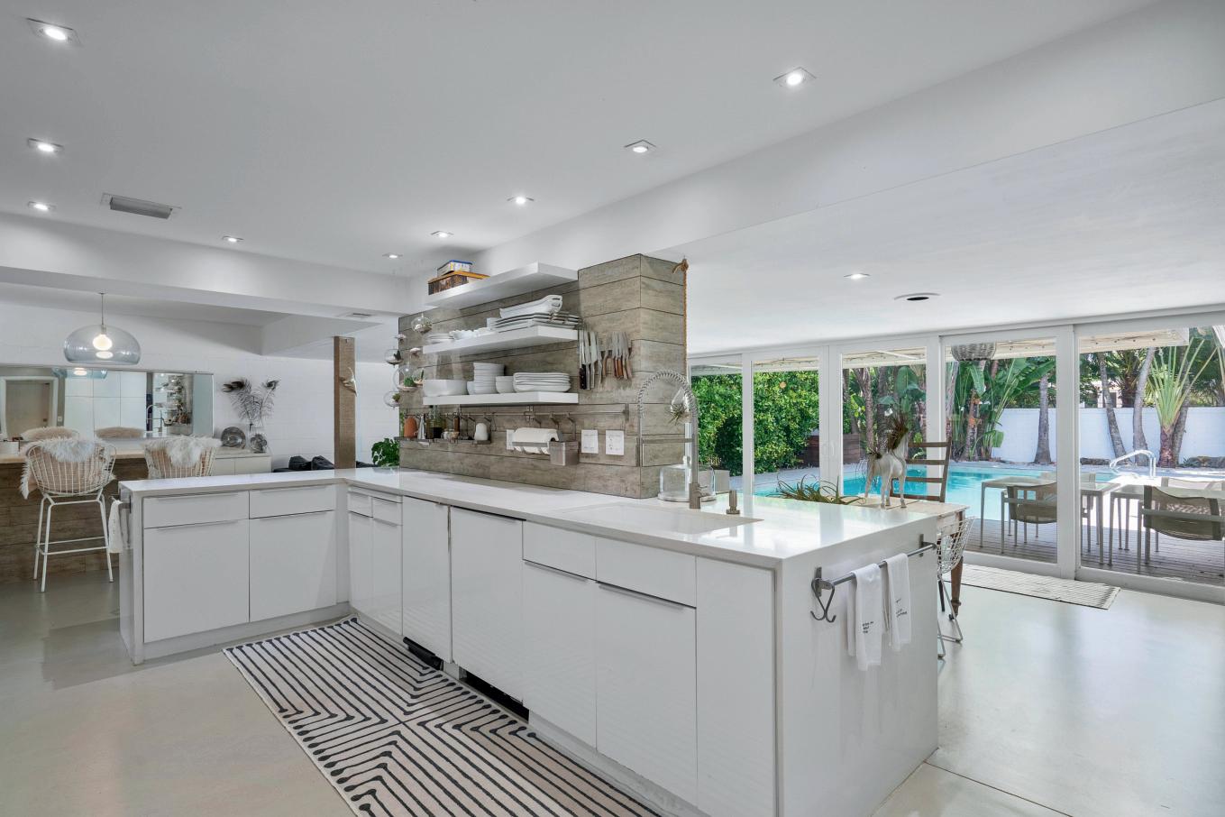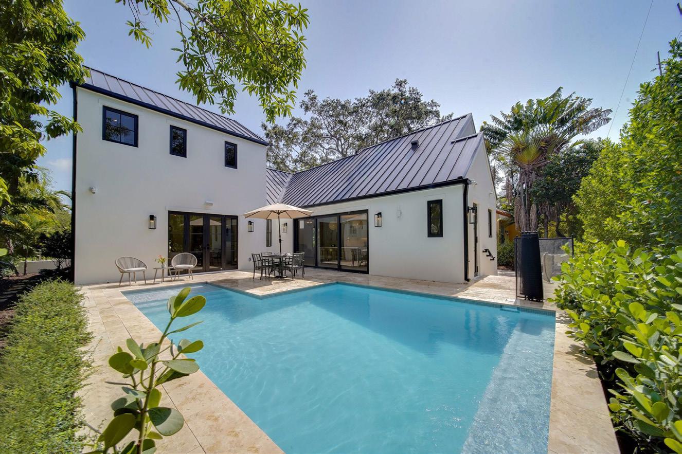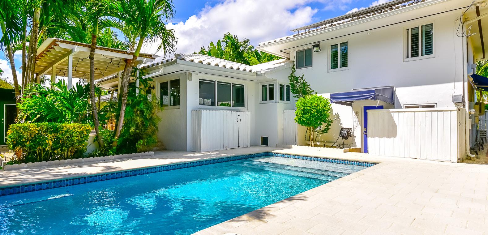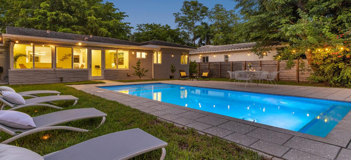 Welcome to River Breeze Retreat, where living is easy alongside Miami’s Little River. This adorable, updated midcentury modern jewel-box pool home lives large! Enter through a welcoming front porch into updated open-flow living, dining with cocktail bar, designer kitchen, and large window-lined sunroom which opens to lush rear gardens and illuminated step-in saltwater pool with spacious patio along the river— perfect for entertaining or relaxation. Sweet dreams await in the main en-suite retreat with updated bath and double walk-in closets, plus great guest room and second full bath down the hall for extra privacy. Fantastic features: fabulous character, large lot, wood floors, impact windows-doors, and conversionready one-car garage. Come on down to the river, where life is a breeze!