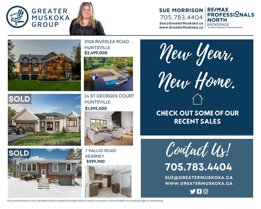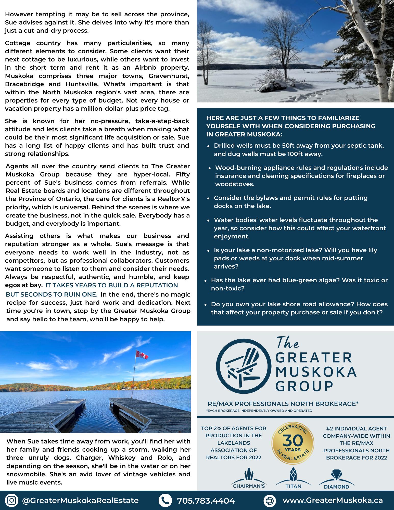SUE MORRISON SALES REPRESENTATIVE 705.783.4404 Sue@GreaterMuskoka.ca www.GreaterMuskoka.ca BROKERAGE *EACHOFFICEINDEPENDENTLYOWNEDANDOPERATED