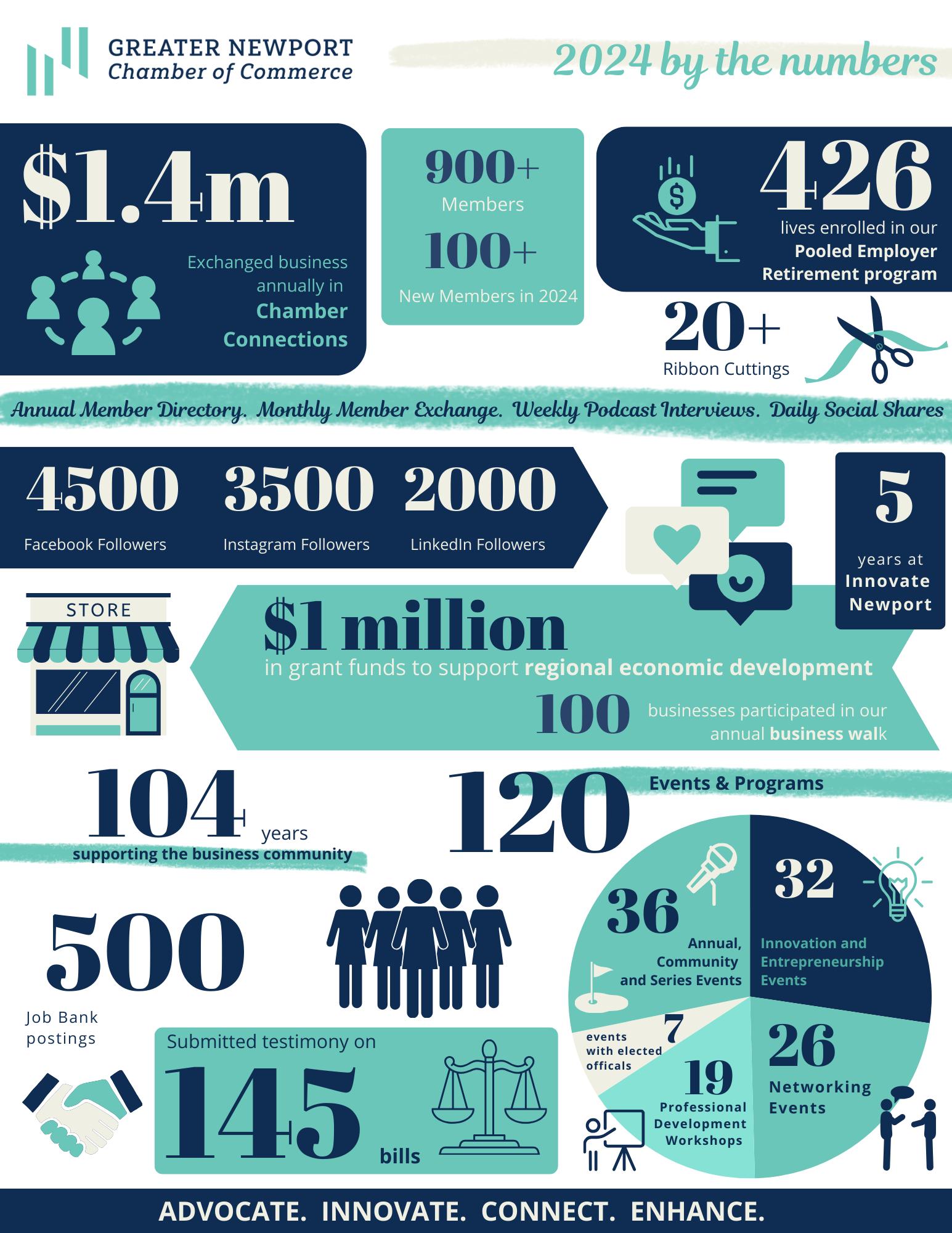 The Greater Newport Region has long been recognized for its unique blend of historic charm, vibrant culture, and forward-thinking innovation. Our Chamber remains committed to supporting businesses of all sizes and industries, fostering connections that not only drive economic prosperity but also enhance the quality of life for everyone who calls this region home.