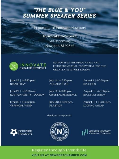 Thursday, August 18th marks the end of this summer’s “Blue & You” Summer Speaker Series at Innovate Newport. Throughout “The Blue & You” Summer Speaker Series, experts have shared how industry, government, non profit and academic partners are building on existing regional, national and global assets to make Rhode Island and Southern New England the leading global center of the Blue Economy. But what is next? During this session, we will hear what’s ahead as Rhode Island continues to strive to set a new 21st century definition for the Blue Economy; one that is, at its core, economically resilient, environmentally sustainable and centered on equitable economic development. Our esteemed panel of experts includes: Susan Daly; Strategic Advisor and Consultant Pete Rumsey; Chief Business Development Officer, URI Research Foundation Christian Cowan; Executive Director; 401 Tech Bridge Erik Brine; Director of Defense R&D Initiatives and Operations; URI Research Foundation, URI Ventures Join us at Innovate Newport on Thursday, August 18th from 4 5:30 pm. Register on Eventbrite: https://www.eventbrite.com/e/288564493167