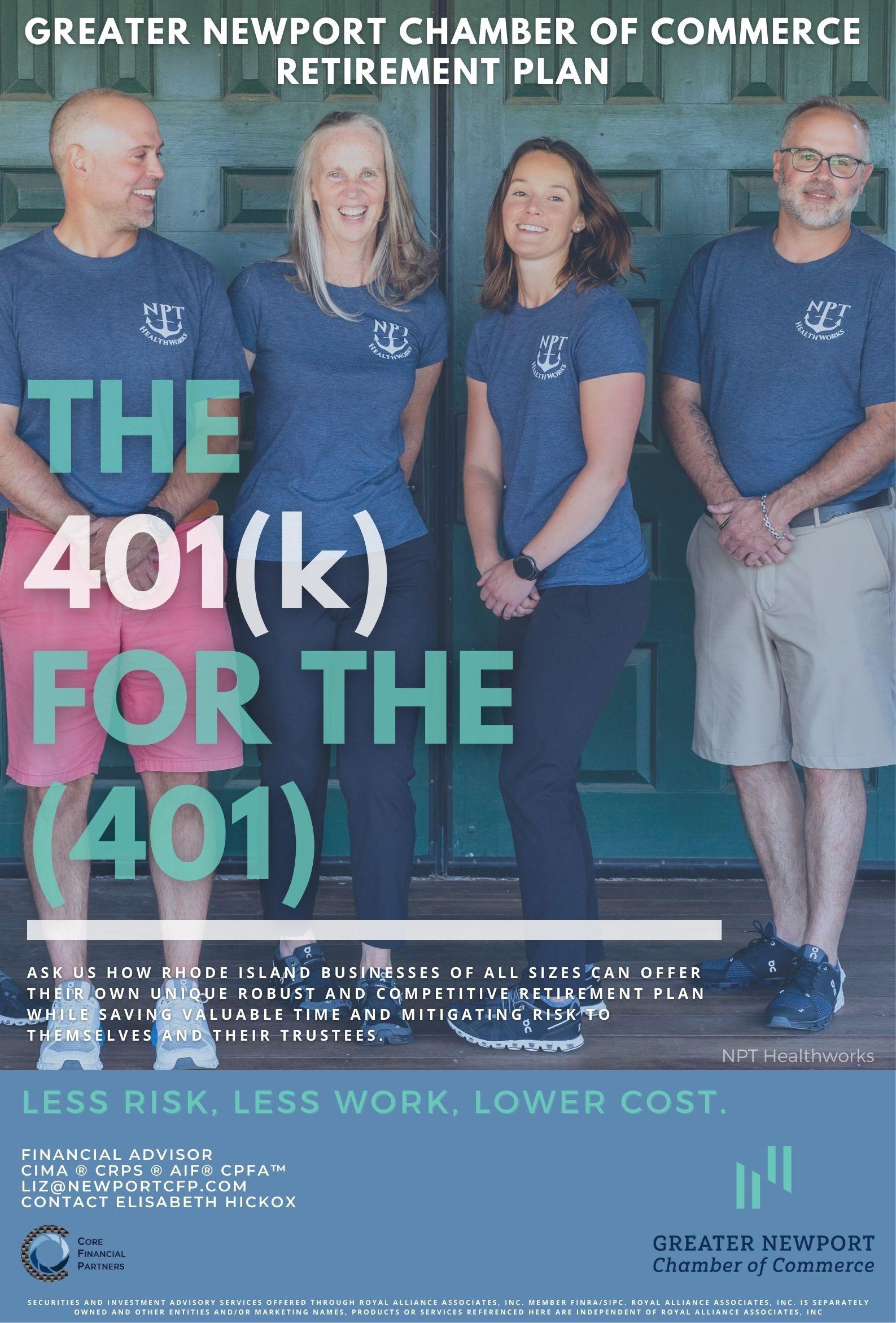 newportchamber.com Initial due diligence and consistent monitoring of service providers Negotiation of administrative fees Liz@newportcfp.com The Greater Newport Chamber of Commerce offers a 401(K) plan for member businesses! Contact for more information Enabled by the SECURE Act in 2020, the Chamber is now able to create pooled employer plans (PEPs), which expands access to retirement plans for all workers by allowing employers from unrelated industries to join one retirement plan. Benefits to the adopting employers include: • Increased administrative efficiencies • Reduced fiduciary risk • Potential cost savings The Chamber provides comprehensive program oversight including: Coordination of participant education Distribution of program materials