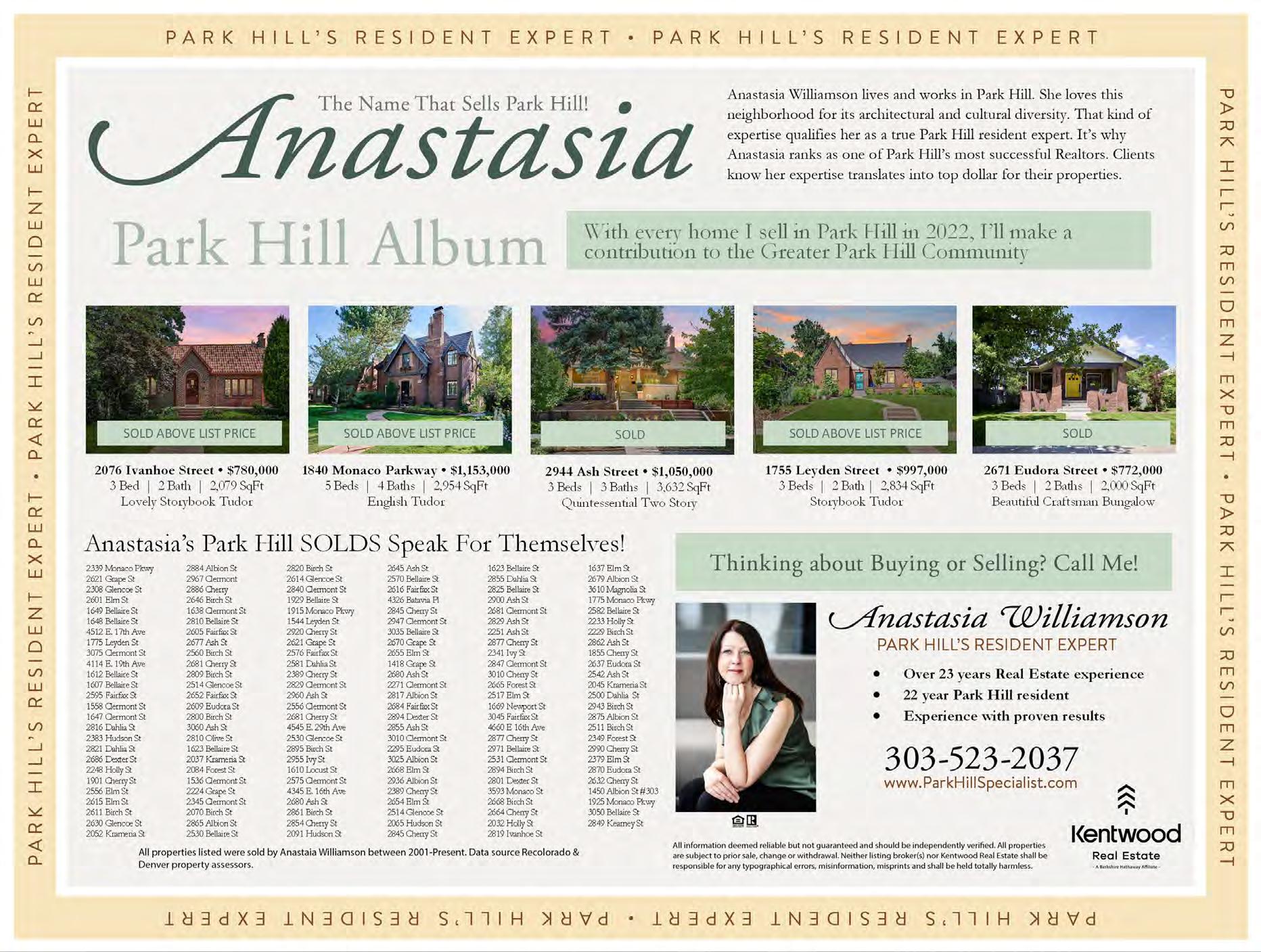 Marcy Eastman I am one of your presenting sponsors for the 45th Annual Park Hill Home Tour! 2222 Forest Street 5 Bed | 5 Bath 5,183 Sq Ft | O ered for $2,200,000 Compass is a licensed real estate broker. All material is intended for informational purposes only and is compiled from sources deemed reliable but is subject to errors, omissions, changes in price, condition, sale, or withdrawal without notice. No statement is made as to the accuracy of any description or measurements (including square footage). This is not intended to solicit property already listed. No financial or legal advice provided. Equal Housing Opportunity. Photos may be virtually Realtor® 720.436.5494 marcy.eastman@compass.com FORSALE MARCY EASTMAN Over 23 years Real Estate experience 22 year Park Hill resident Experience with proven results 303-523-2037 www.ParkHillSpecialist.com SOLD ABOVE LIST PRICE FOR SALE Anastasia's Park Hill SOLDS Speak For Themselves! All properties listed were sold by Anastasia Williamson between 2001 - Present. Data source REColorado & Denver property assessors. 2860 Albion Street • $849,000 4 Beds | 3 Baths | 2,053 SqFt Pristine Cottage 2944 Ash Street • $1,050,000 3 Beds | 3 Baths | 3,632 SqFt Quintessential Two Story 2671 Eudora Street • $772,000 3 Beds | 2 Baths | 2,000 SqFt Beautiful Craftsman Bungalow 2339 Monaco Pkwy 2621 Grape St 2308 Glencoe St 2601 Elm St 1649 Bellaire St 1648 Bellaire St 4512 E. 17th Ave 1775 Leyden St 3075 Clermont St 4114 E. 19th Ave 1612 Bellaire St 1607 Bellaire St 2595 Fairfax St 1558 Clermont St 1647 Clermont St 2816 Dahlia St 2383 Hudson St 2821 Dahlia St 2686 Dexter St 2248 Holly St 1901 Cherry St 2556 Elm St 2615 Elm St 2611 Birch St 2630 Glencoe St 2052 Krameria St 2884 Albion St 2967 Clermont 2886 Cherry 2646 Birch St 1638 Clermont St 2810 Bellaire St 2605 Fairfax St 2677 Ash St 2560 Birch St 2681 Cherry St 2809 Birch St 2514 Glencoe St 2652 Fairfax St 2609 Eudora St 2800 Birch St 3060 Ash St 2810 Olive St 1623 Bellaire St 2037 Krameria St 2084 Forest St 1536 Clermont St 2224 Grape St 2345 Clermont St 2070 Birch St 2865 Albion St 2530 Bellaire St 2820 Birch St 2614 Glencoe St 2840 Clermont St 1929 Bellaire St 1915 Monaco Pkwy 1544 Leyden St 2920 Cherry St 2621 Grape St 2576 Fairfax St 2581 Dahlia St 2389 Cherry St 2829 Clermont St 2960 Ash St 2556 Clermont St 2681 Cherry St 4545 E. 29th Ave 2530 Glencoe St 2895 Birch St 2955 Ivy St 1610 Locust St 2575 Clermont St 4345 E. 16th Ave 2680 Ash St 2861 Birch St 2854 Cherry St 2091 Hudson St 2645 Ash St 2570 Bellaire St 2616 Fairfax St 4326 Batavia Pl 2845 Cherry St 2947 Clermont St 3035 Bellaire St 2670 Grape St 2655 Elm St 1418 Grape St 2680 Ash St 2271 Clermont St 2817 Albion St 2684 Fairfax St 2894 Dexter St 2855 Ash St 3010 Clermont St 2295 Eudora St 3025 Albion St 2668 Elm St 2936 Albion St 2389 Cherry St 2654 Elm St 2514 Glencoe St 2065 Hudson St 2845 Cherry St 1623 Bellaire St 2855 Dahlia St 2825 Bellaire St 2900 Ash St 2681 Clermont St 2829 Ash St 2251 Ash St 2877 Cherry St 2341 Ivy St 2847 Clermont St 3010 Cherry St 2665 Forest St 2517 Elm St 1669 Newport St 3045 Fairfax St 4660 E 16th Ave 2877 Cherry St 2971 Bellaire St 2531 Clermont St 2894 Birch St 2801 Dexter St 3593 Monaco St 2668 Birch St 2664 Cherry St 2032 Holly St 2819 Ivanhoe St 1637 Elm St 2679 Albion St 3610 Magnolia St 1775 Monaco Pkwy 2582 Bellaire St 2233 Holly St 2229 Birch St 2862 Ash St 1855 Cherry St 2637 Eudora St 2542 Ash St 2045 Krameria St 2500 Dahlia St 2943 Birch St 2875 Albion St 2511 Birch St 2349 Forest St 2990 Cherry St 2379 Elm St 2870 Eudora St 2632 Cherry St 1450 Albion St #303 1925 Monaco Pkwy 3050 Bellaire St 2849 Kearney St 1830 Monaco Pkwy 2023 PARK HILL SNAPSHOT 1755 Leyden Street • $997,000 3 Beds | 2 Baths | 2,834 SqFt Storybook Tudor Avg. Sales Price $1,038,000 Days on Market 21 Avg. Price Per Sq Ft • $682