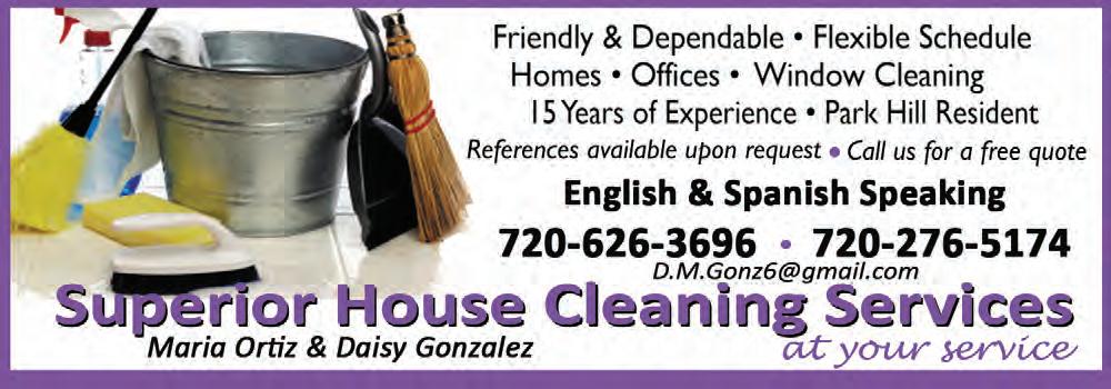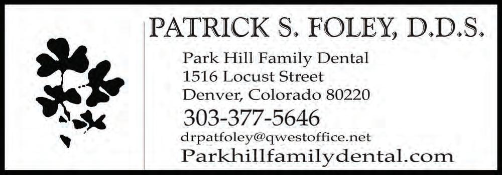 4628 E 23rd Ave, Denver CO 80207 www.honeyhillcafe.com • 720 242 6048 Full indoor and patio seating available. OpEn EvEry DAy At 7Am Wine and local beers • Happy Hour daily HOUSE CLEANING Providing 25 years of personalized cleaning service in Central Park & Park Hill Paulina Leon 720-628-6690 Deep & Detail-Oriented Cleaning • Offices/Homes/ Apartments/Airbnb • Move-in/Move-out • Eco-Friendly Cleaning Products (upon request) • Magnificent References Prep, power washing, professional. Owned and operated by Park Hill resident with over 20 years experience • Free estimate • Senior citizen and veteran discount. JR Painting 720-485-7207 or jpabz04@gmail.com InteRIoR & exteRIoR PaIntIng MAYFAIR VISION CLINIC Dr. Janice I. Jarret Adult and Children’s Vision • Complete Visual, Eye Health and Glaucoma Testing • All Types of Contact Lenses • Frames with One Year Guarantee • Most Insurances Accepted • Free Adjustments and Minor Frame Repair • 15% Discount for Senior Citizens 303.333.9898 1336 Leyden Across from Safeway FALL IS COMING! Do your double-hung windows open, stay open? I can fix them & insulate them. Other Questions? Call David, experienced restorer! 720.550.2786 4624 East 23rd Ave., Denver DE ntA l Arts 5280 Best Dentist 2022 cosm E tic & fA mily DEntistry thomas J. croghan D.D.s, P.c. 303-377-8662 complete and comprehensive dental care for the whole family! 5280 Best Dentist 2023 Ireland’s Finest Painting Co. Bringing Color to Park Hill Years + 10% OFF all interior jobs performed in December - March 2024 (303) 512-8777 irelands nestinc.com We’re Getting Busy, Call Today!