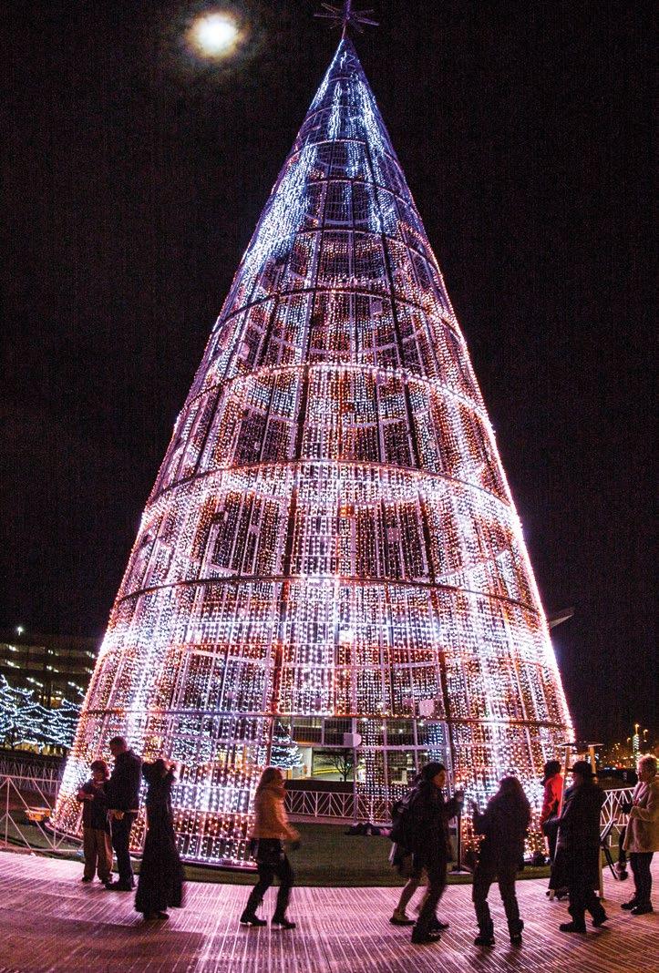 The 110-foot-tall tree is 10 feet higher than the tallest Rockefeller Center Christmas tree in history and contains 60,000 LED lights. Up to 140 people can gather under the tree at once for an immersive light and holiday music show and experience. The free light shows are held nightly every 15 minutes between 5 p.m. and 10 p.m