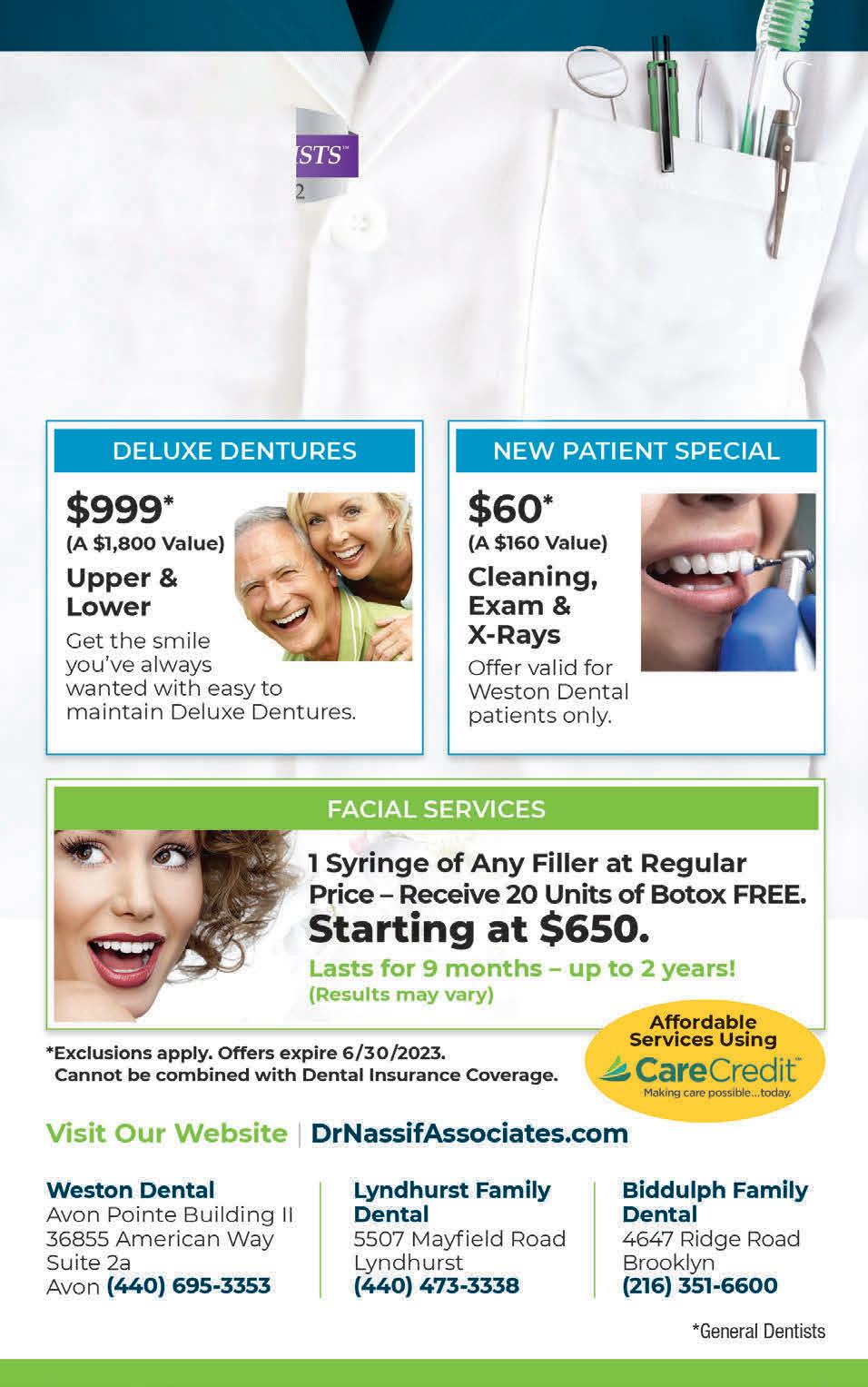 COURTESY CITY OF BROOKLYN Starting at $650. Lasts for 9 months – up to 2 years! Lasts for 9 months - up to 2 years! Come See What We Are All About. DELUXE DENTURES NEW PATIENT SPECIAL $60* (A $160 Value) Cleaning, Exam & X-Rays Offer valid for Weston Dental patients only. FACIAL SERVICES 1 Syringe of Any Filler at Regular Price – Receive 20 Units of Botox FREE. Starting at $650. Lasts for 9 months – up to 2 years! DELUXE DENTURES SINGLE CROWN $735* (A $1,200 Value) Single Dental Crown Restore a tooth to its normal size, shape, and function. *With the Dental Direct membership. $999* (A $1,800 Value) Upper & Lower Get the smile you’ve always wanted with easy to maintain Deluxe Dentures. FACIAL SERVICES 1 Syringe of Any Filler at Regular Price – Plus 20 Units of Botox FREE. Starting at $650. Lasts for 9 months – up to 2 years! (Results may vary) Affordable Services Using Single Implant, Abutment, and Crown. $2,099* (A $4,000 Value) *Exclusions apply www.drnassifassociates.com 4647 Ridge Road Brooklyn *Exclusions apply. Cannot be combined with Dental Insurance Coverage. *General Dentists (216) 351-6600 DR. NASSIF & ASSOCIATES 6 Year Award Winner | 2018 - 2023 Voted Cleveland’s