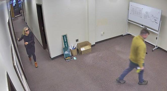 In CCTV footage provided to Scene, McDaniel is seen in an overcoat and sunglasses storming towards Seren’s office around 12:58 p.m. After Seren exits, she leads him to a room down the hall, where, around 1:18 p.m., McDaniel