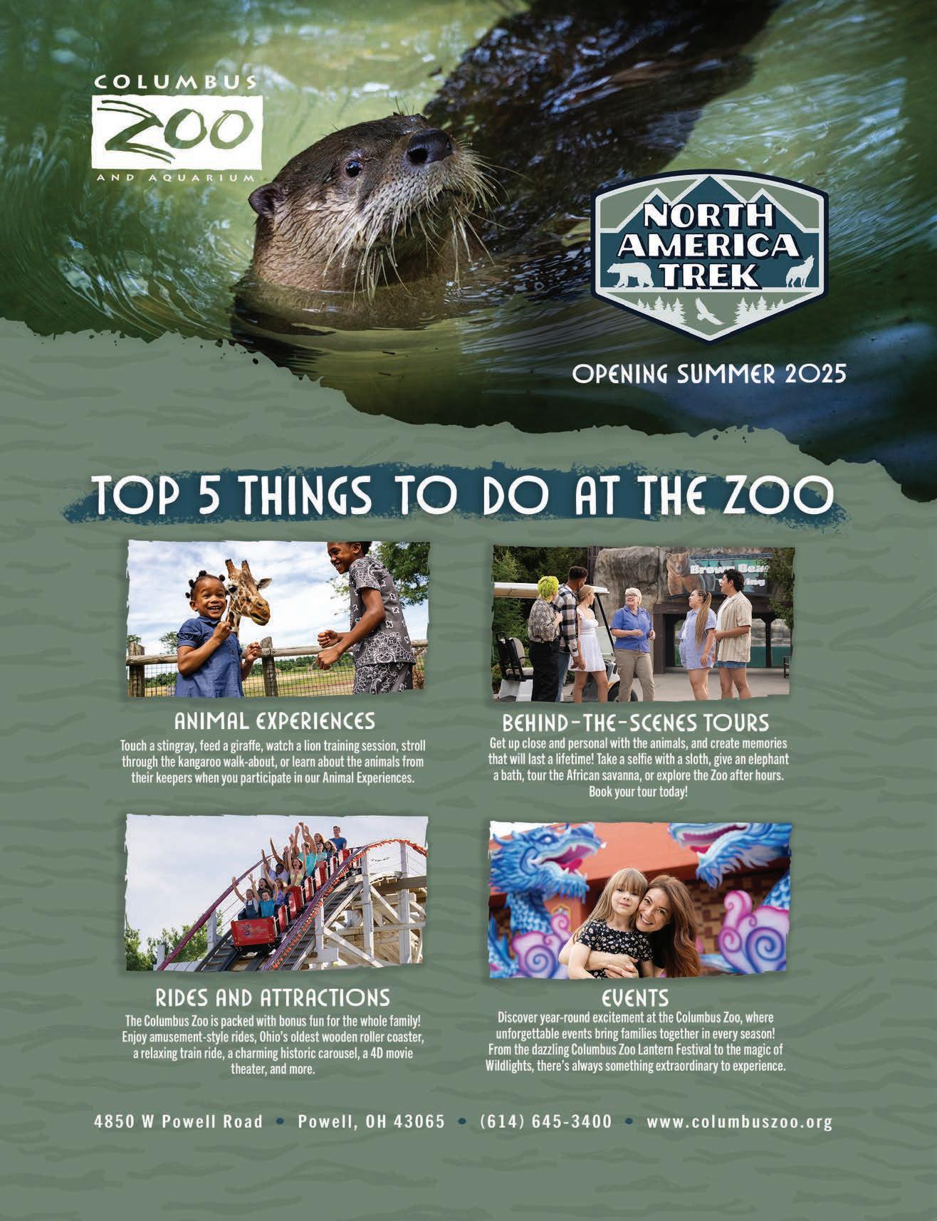 Nothing beats the summer heat like a visit to Zoombezi Bay — with 17 water slides, a giant wave pool, an action river, a lazy river just for adults and much more. New for 2025 are three waterslides. The only one of its kind in the world, Captina Falls lets guests race one another headfirst down a 51-foot waterslide. Experience extreme G-forces on The Hive, another world first, as a two-person tube speeds through 720-degree helixes in a hollow spiral enclosure open to the sky. Face another rider on a two-person raft through two halfpipe cutbacks and two funnels on Mussel Mayhem, the first waterslide of its kind in the Midwest. All Zoombezi Bay admission tickets include free admission to the worldclass Columbus Zoo and Aquarium right next door. Add on activities like an after-hours tour or a chance to feed the giraffes and get up-close-andpersonal animal interactions.