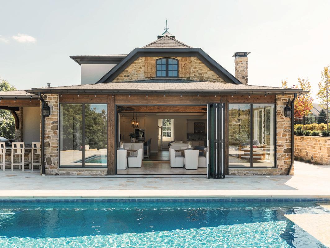 Inspired by a French country cottage, a pool house in Chagrin Falls mirrors the main home’s architectural detail and serves as a year-round space to gather, entertain and relax by the water or cozy up by a wood-burning fireplace.