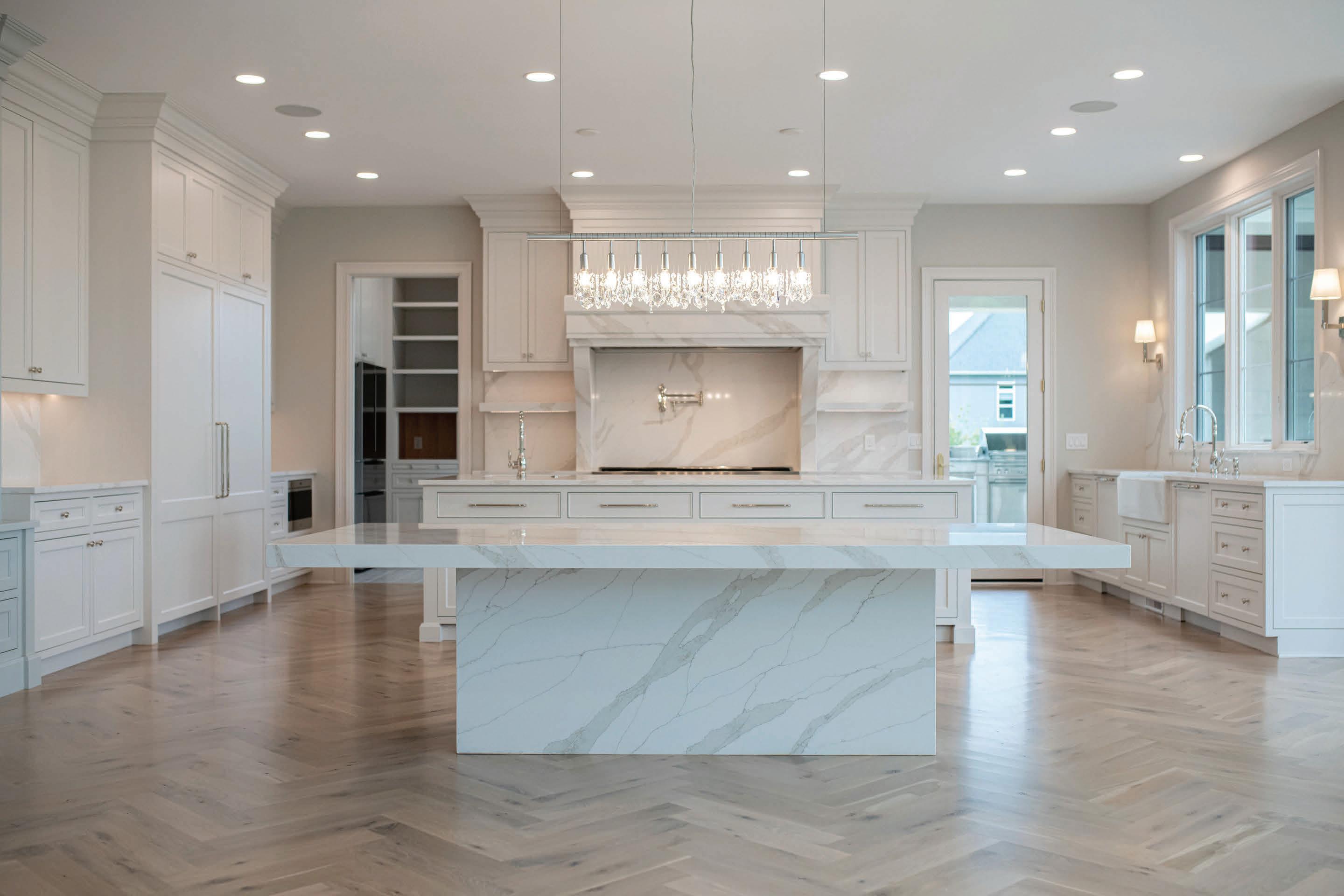 An adjacent dry bar includes glass, lighted shelving and a secondary undercounter refrigerator. The backsplash is finished in the same luxury vinyl plank surface as the flooring, along with the backdrop of the wine case, creating a seamless visual flow throughout the main floor. Also, quartz with dynamic veining for countertops and the range backsplash provide continuity.