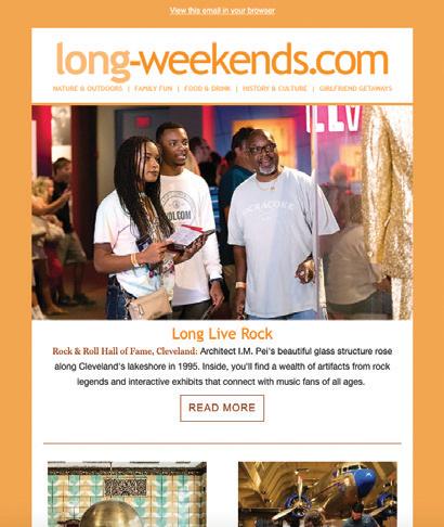 Are you receiving our email newsletters? Learn about fun experiences throughout the state, get great food and drink ideas or plan for your next weekend getaway. Sign up at ohiomagazine.com/ newsletters