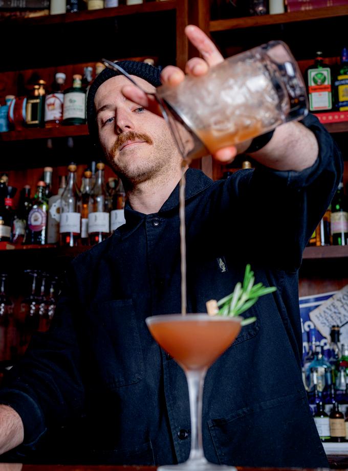 The wintertime lineup of cocktails included such imaginative o erings as a “no egg egg nog” called “Ghost of Grandeur,” with bourbon, Jamaican rum, cognac, amaro, vanilla liqueur, chai, gomme syrup, coconut and soy milk, nutmeg and cinnamon. While most drinks cycle o the menu each season, a number of popular drinks from past years continue on the menu as “Legends.” One of them, Rabbit’s Foot, is made of blanco tequila, ginger agave, cayenne, pineapple, lemon and aromatic bitters. It remains one of their biggest sellers. A number of curated beers and wines are also available, and if a customer wants a classic drink like an old fashioned or negroni, the bartenders are happy to oblige.
