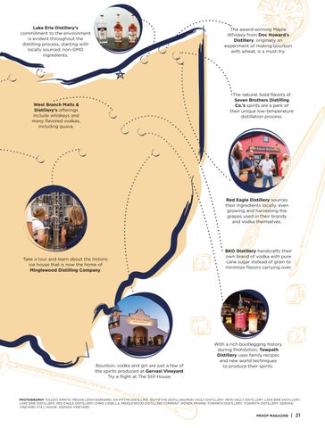 PHOTOGRAPHY TOLEDO SPIRITS: MEGAN LEIGH BARNARD; SIX-FIFTHS DISTILLING: SIX-FIFTHS DISTILLING;IRON VAULT DISTILLERY: IRON VAULT DISTILLERY; LAKE ERIE DISTILLERY: LAKE ERIE DISTILLERY; RED EAGLE DISTILLERY: CHRIS CASELLA; MINGLEWOOD DISTILLING COMPANY: WENDY PRAMIK; TOWPATH DISTILLERY: TOWPATH DISTILLERY; GERVASI VINEYARD STILL HOUSE: GERVASI VINEYARD Take a tour and learn about the historic ice house that is now the home of Minglewood Distilling Company. Bourbon, vodka and gin are just a few of the spirits produced at Gervasi Vineyard Try a flight at The Still House.