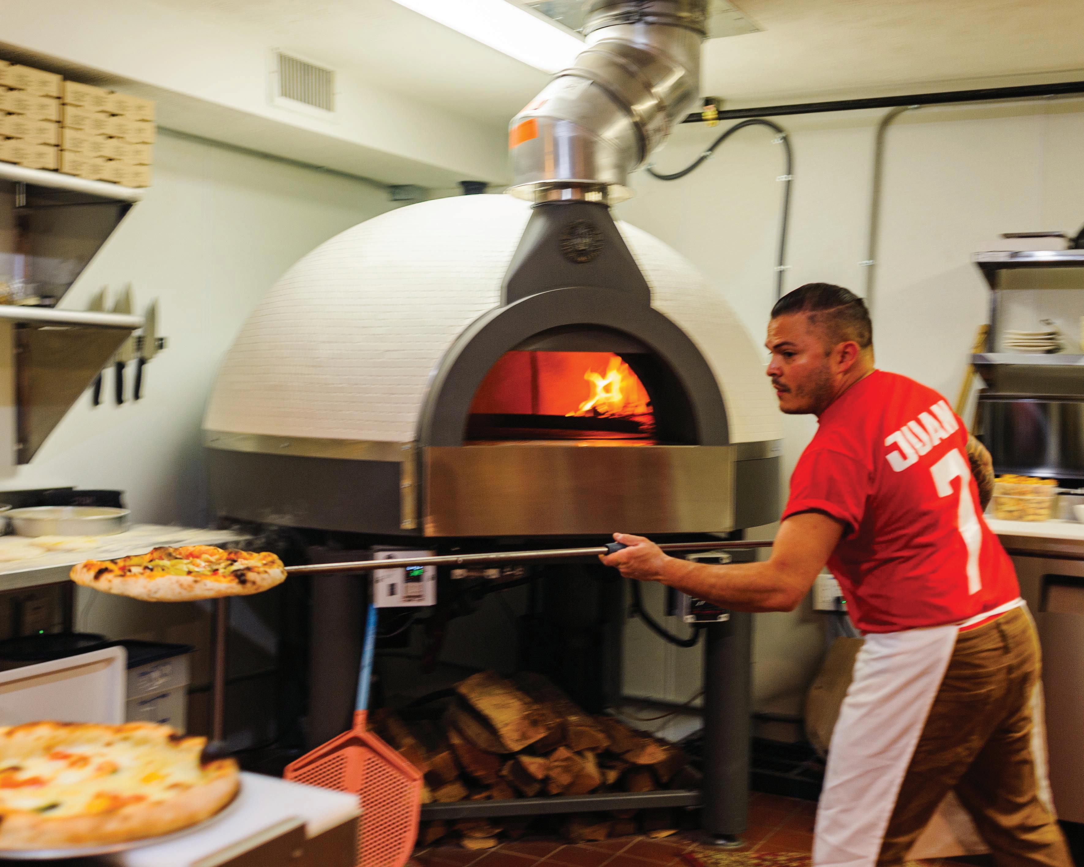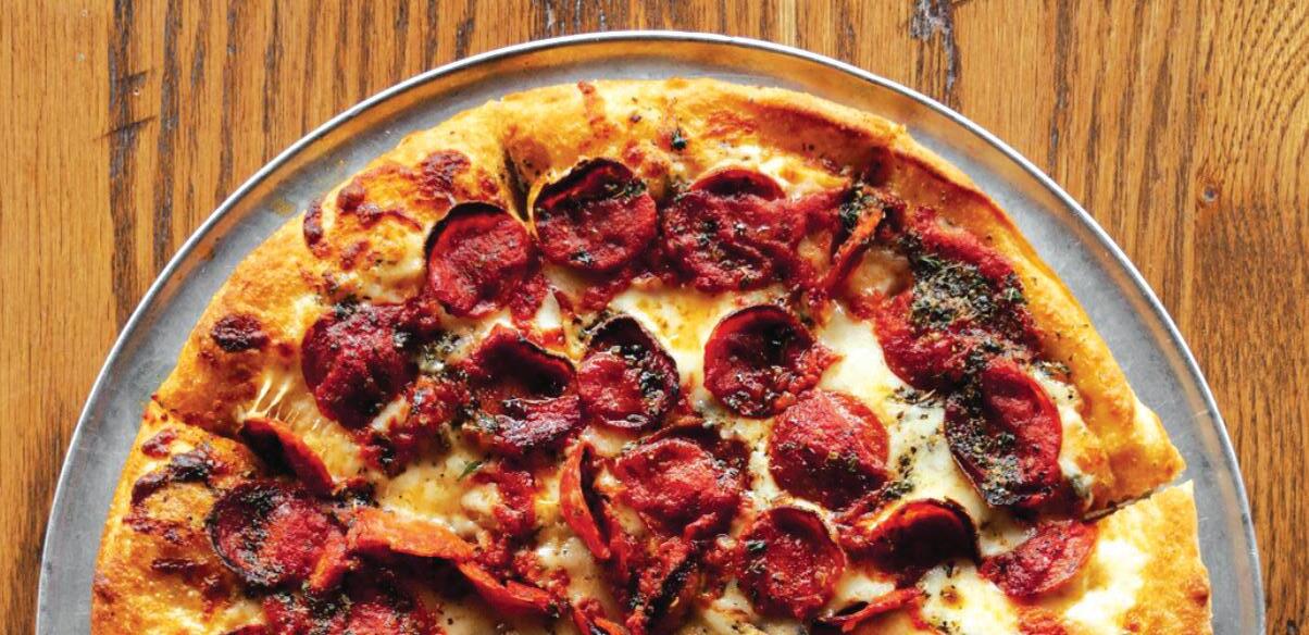 Hand stretched 11”- 6 slice wood-fired pizza topped with house sweet and savory tomato sauce, house sausage, fresh shredded mozzarella cheese, roasted garlic, pepperoni, peppadew peppers & fresh basil.