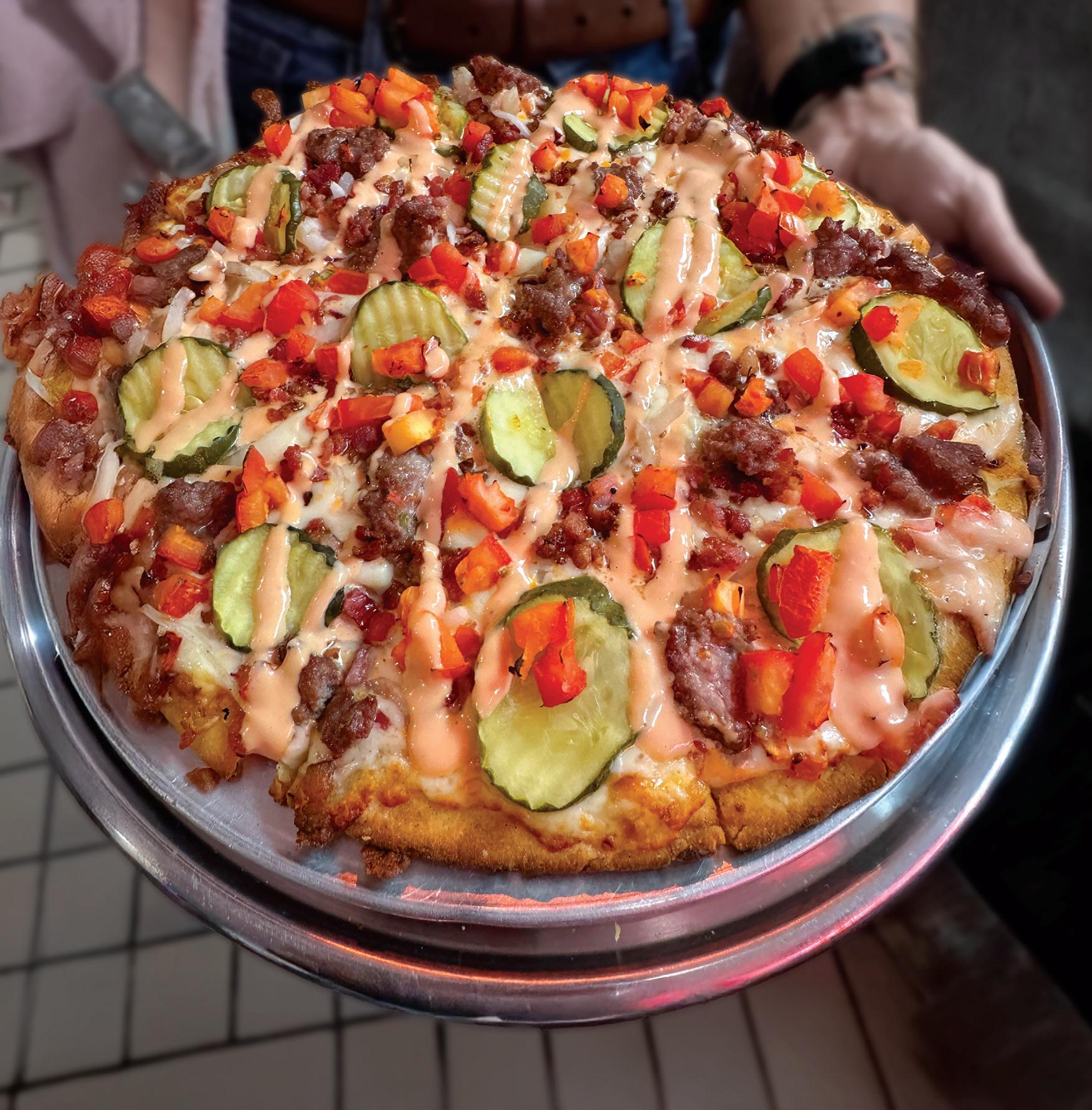 Sicilian Tomato, House Grated Provolone, Pepperoni, Chopped Onion, Fresh Basil, Finished w/ Chef Jimmy’s Hot Honey on Mario Fazio’s Hand Stretched Dough